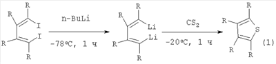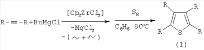 В предлагаемом способе используются в качестве исходных соединений дизамещенный ацетилен, н-BuMgCl и S8 с участием катализатора Cp2ZrCl2. В известном способе тетраалкилтиофены (1) получают из 1,4-дийодбутадиенов, бутиллития и сероуглерода.