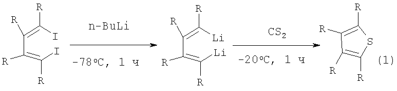 Известный способ синтеза 2,3,4,5-тетраалкилтиофенов (1) предполагает использование труднодоступных 1,4-дииодо-1,3-бутадиенов, крайне пирофорного n-BuLi и сероуглерода (СS2), представляющего собой легковоспламеняющуюся, легколетучую и высокотоксичную жидкость. Кроме того, в ходе реакции необходимо поддерживать низкую температуру -78°С.