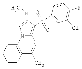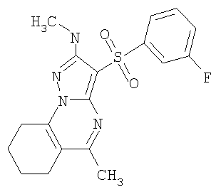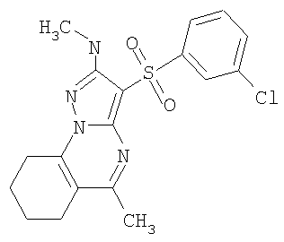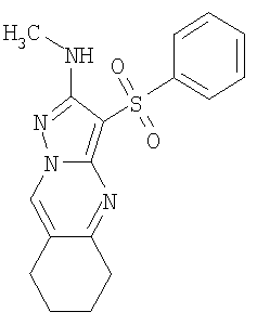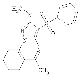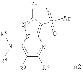 А1: Ar = алкил, арил; R1 и R2=Н, ОН, алкил, алкокси; R3 и R4=Н, алкил, арил. А2: Ar = арил, гетероциклил; R1=Н, алкил, алкилтио; R2=Н, алкил, галоген; R3=Н, алкил, гидроксиалкил; R4 и R5=Н; NR4R5 = пиперазинил. С целью разработки новых высокоэффективных нейропротекторных лекарственных средств авторами данного изобретения выполнены широкие исследования в ряду замещенных 3-сульфонил-пиразоло[1,5-а]пиримидинов, в результате чего найдены новые лекарственные начала, представляющие собой антагонисты 5-НТ6 рецепторов. Ниже приведены определения терминов, которые использованы в описании этого изобретения. «Агонисты» означают лиганды, которые, связываясь с рецепторами данного типа, активно способствуют передаче этими рецепторами свойственного им специфического сигнала и тем самым вызывают биологический ответ клетки. «Азагетероцикл» означает ароматическую или неароматическую моноциклическую или полициклическую систему, содержащую в цикле, по крайней мере, один атом азота. Азагетероцикл может иметь один или более «заместителей циклической» системы. «Алкил» означает алифатическую углеводородную линейную или разветвленную группу с 1-12 атомами углерода в цепи. Разветвленная означает, что алкильная цепь имеет один или несколько «низших алкильных» заместителей. Алкил может иметь один или несколько одинаковых или различных заместителей («алкильных заместителей»), включая галоген, алкенилокси, циклоалкил, арил, гетероарил, гетероциклил, ароил, циано, гидрокси, алкокси, карбокси, алкинилокси, аралкокси, арилокси, арилоксикарбонил, алкилтио, гетероарилтио, аралкилтио, арилсульфонил, алкилсульфонилгетероаралкилокси, аннелированный гетероарилциклоалкенил, аннелированный гетероарилциклоалкил, аннелированный гетероарилгетероцикленил, аннелированный гетероарилгетероциклил, аннелированный арилциклоалкенил, аннелированный арилциклоалкил, аннелированный арилгетероцикленил, аннелированный арилгетероциклил, алкоксикарбонил, аралкоксикарбонил, гетероаралкилоксикарбонил или Rk «Алкилокси» означает алкил-O-группу, в которой алкильные группы определены в данном разделе. Предпочтительными алкилокси группами являются метокси, этокси, н-пропокси, изо-пропокси и н-бутокси. «Анксиолитик» или «Транквилизатор» означает лекарственное средство, предназначенное для лечения тревожных расстройств. «Аннелированный цикл» (конденсированный цикл) означает би- или полициклическую систему, в которой аннелированный цикл и цикл или полицикл, с которым он «аннелирован», имеют как минимум два общих атома. «Антагонисты» означают лиганды, которые связываются с рецепторами определенного типа и не вызывают активного клеточного ответа. Антагонисты препятствуют связыванию агонистов с рецепторами и тем самым блокируют передачу специфического рецепторного сигнала. «Антидепрессант» означает лекарственное средство, предназначенное для лечения депрессии. «Антипсихотик» означает лекарственное средство, предназначенное для лечения психотических заболеваний. «Арил» означает ароматическую моноциклическую или полициклическую систему, включающую от 6 до 14 атомов углерода, преимуществено от 6 до 10 атомов углерода. Арил может содержать один или более «заместителей циклической системы», которые могут быть одинаковыми или разными. Представителями арильных групп являются фени