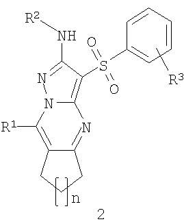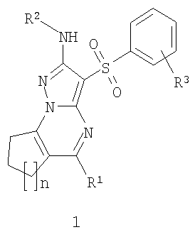 где R1 представляет собой атом водорода или C1-С3алкил; R2 представляет собой C1-С3алкил; R3 представляет собой атом водорода, один или два необязательно одинаковых атома галогена, C1-С3алкил или необязательно замещенный С1-С3алкилом гидроксил; n представляет собой целое число 1, 2 или 3. Более предпочтительными соединениями общей формулы 1 являются 2-алкиламино-3-арилсульфонил-7,8-дигидро-6Н-циклопента[е]пиразоло[1,5-а]пиримидины общей формулы 1.1, 2-алкиламино-3-арилсульфонил-6,7,8,9-тетрагидро-циклогексано[е]пиразоло[1,5-а]пиримидины общей формулы 1.2 и 2-алкиламино-3-арилсульфонил-7,8,9,10-тетрагидро-6Н-циклогепта[е]пиразоло[1,5-а]пиримидины общей формулы 1.3,