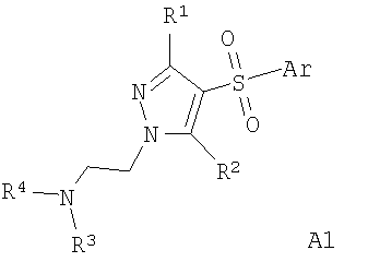 Еще одним привлекательным свойством антагонистов 5-НТ6 рецепторов является их способность подавлять аппетит, что может привести к созданию на их основе принципиально новых средств для понижения избыточного веса и ожирения [Vicker S.P., Dourish C.T. Serotonin receptor ligands and the treatment of obesity. Curr. Opin. Investig. Drugs. 2004; 5:377-388]. Этот эффект подтвержден во многих исследованиях [Holenz J., Pauwels P.J., Diaz J.L., Merce R., Codony X., Buschmann H. Medicinal chemistry strategies to 5-НТ6 receptor ligands as potential cognitive enhancers and antiobesity agents. Drug Disc. Today. 2006; 11:283-299. Davies S.L. Drug discovery targets: 5-НТ6 receptor. Drug Future. 2005; 30:479-495], его механизм основан на подавлении антагонистами 5-НТ6 рецепторов сигналинга гамма-аминомасляной кислоты и увеличении выброса альфа-меланоцит-стимулирующего гормона, что в конечном итоге приводит к уменьшению потребности в пище [Woolley M.L. 5-ht6 receptors. Curr. Drug Targets CNSNeurol. Disord. 2004; 3:59-79]. В настоящее время два антагониста 5-НТ66 рецепторов представляется оригинальным и перспективным подходом к созданию новых лекарственных средств для лечения широкого круга неврологических и нейродегенеративных заболеваний и когнитивных расстройств. В литературе имеются значительное число публикаций, посвященных биологически активным сульфонилпроизводным азагетероциклов, в том числе лигандам серотониновых рецепторов. Так, например, известны замещенные 1-(2-аминоэтил)-4-арилсульфонил-пиразолы, общей формулы А1, как лиганды серотониновых 5-НТ2с рецепторов [WO 2003057674 А1], и 7-амино-3-сульфонил-пиразоло[1,5-а]пиримидины А2, как антагонисты серотониновых 5-НТ6 рецепторов [ЕР 941994 А1, 1999]