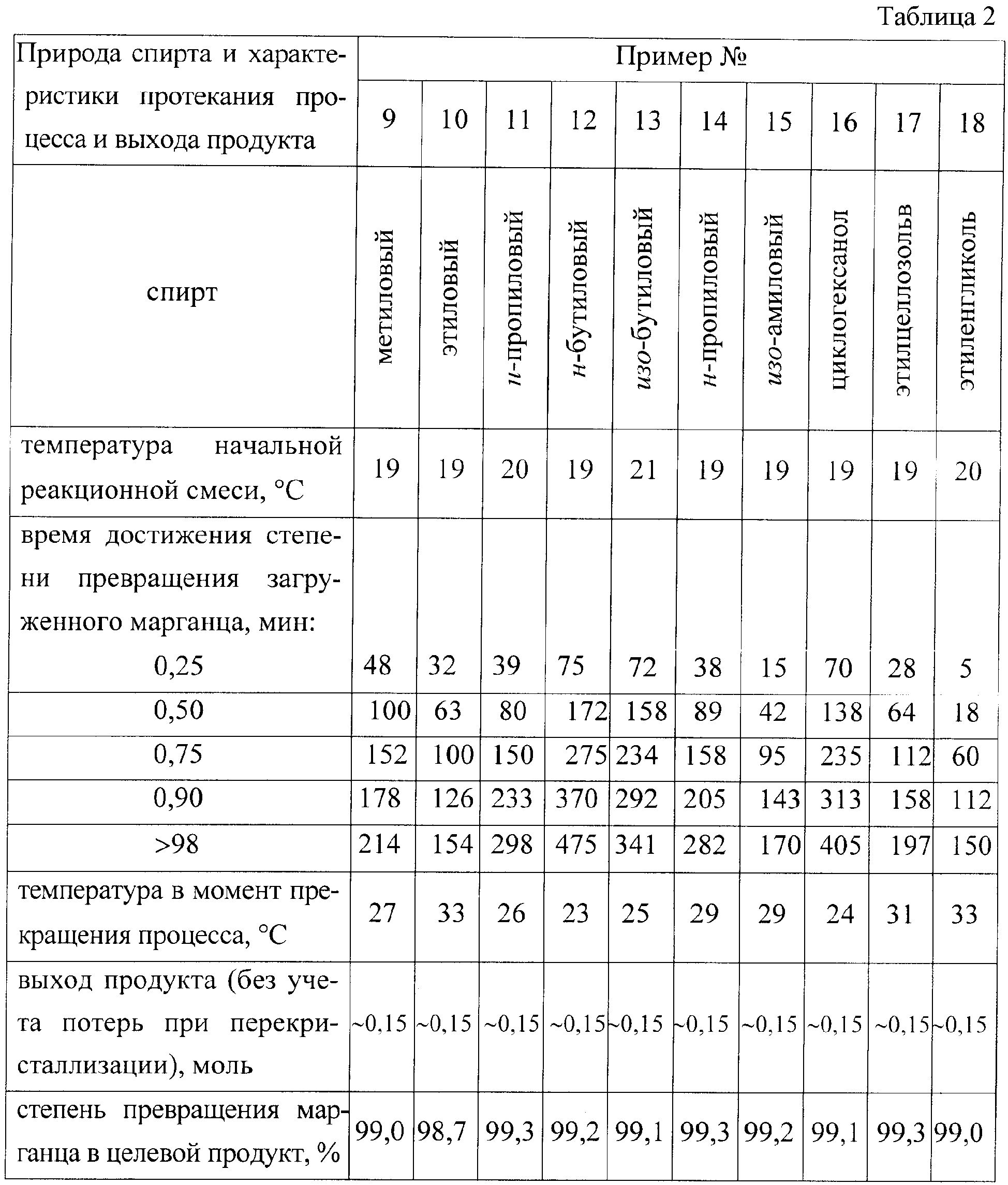 Примеры Реактор, соотношение масс загрузок стеклянного бисера и спирта, начальное содержание марганца в загрузке, операции запуска и проведения процесса, контроля за ходом его протекания, остановки, отделения реакционной смеси от бисера и выделения из нее продукта аналогичны описанным в примере 3. Отличаются природой использованного спирта. Природа спирта и полученные результаты приведены в табл.2. Положительный эффект предлагаемого решения состоит: 1. В предлагаемом способе нет никаких вспомогательных реагентов, катализаторов и добавок, которые бы не поставляли свою массу в целевой продукт. 2. В предлагаемом решении нет сточных вод и необходимости в использовании подвода внешнего тепла. 3. Данный процесс допускает работу со многими спиртами по единой технологии и в одном и том же оборудовании. 4. Аппаратурное оформление заявляемого процесса простое и не содержит котлонадзорных аппаратов. 5. Отделение целевого продукта от реакционной смеси производится простым фильтрованием с возвратом фильтрата и промывного спирта в повторный процесс. Рециркуляция продукта с указанным возвратом небольшая, что предопределено весьма плохой растворимостью алкоголята в спирте, из которого он получен.