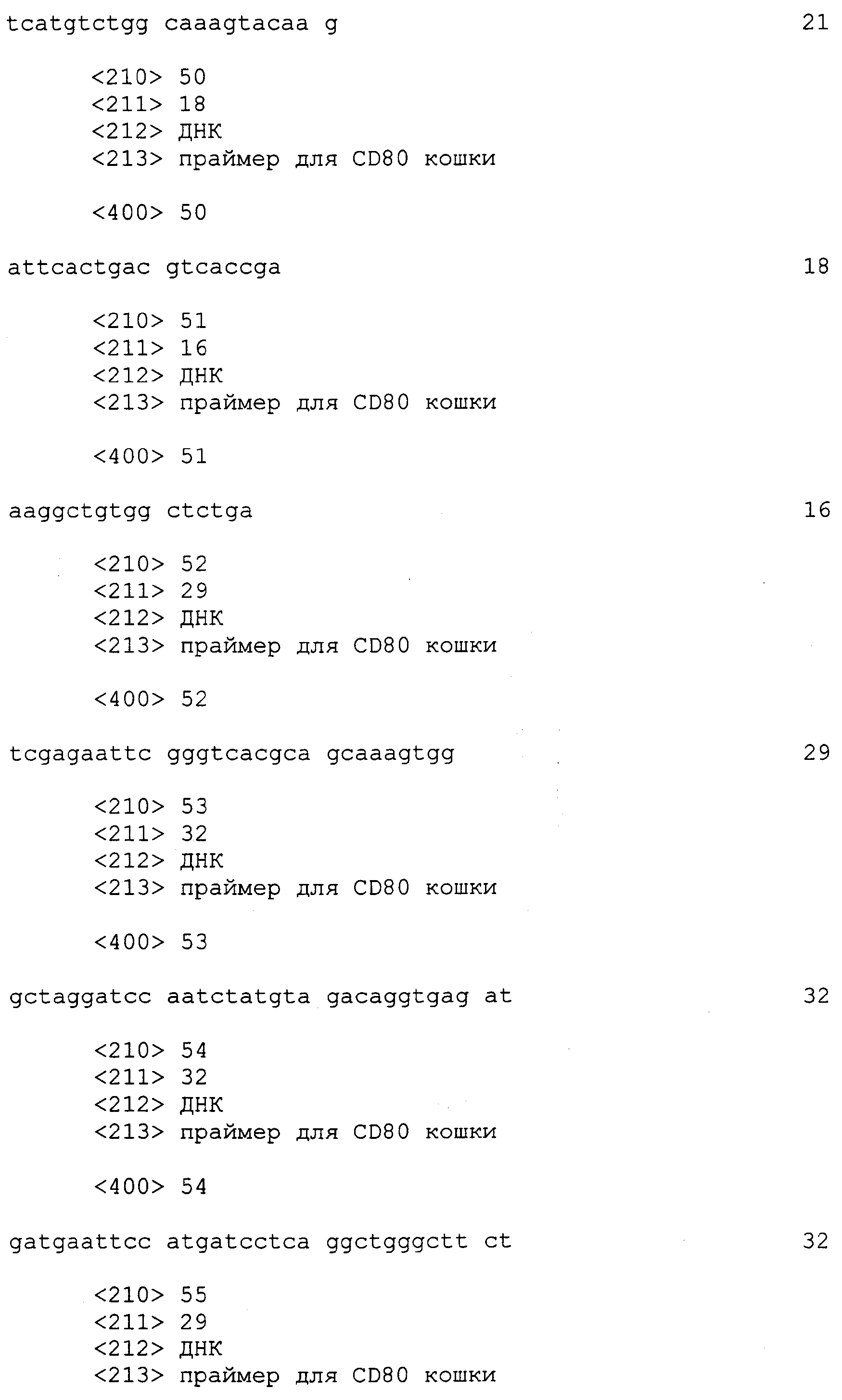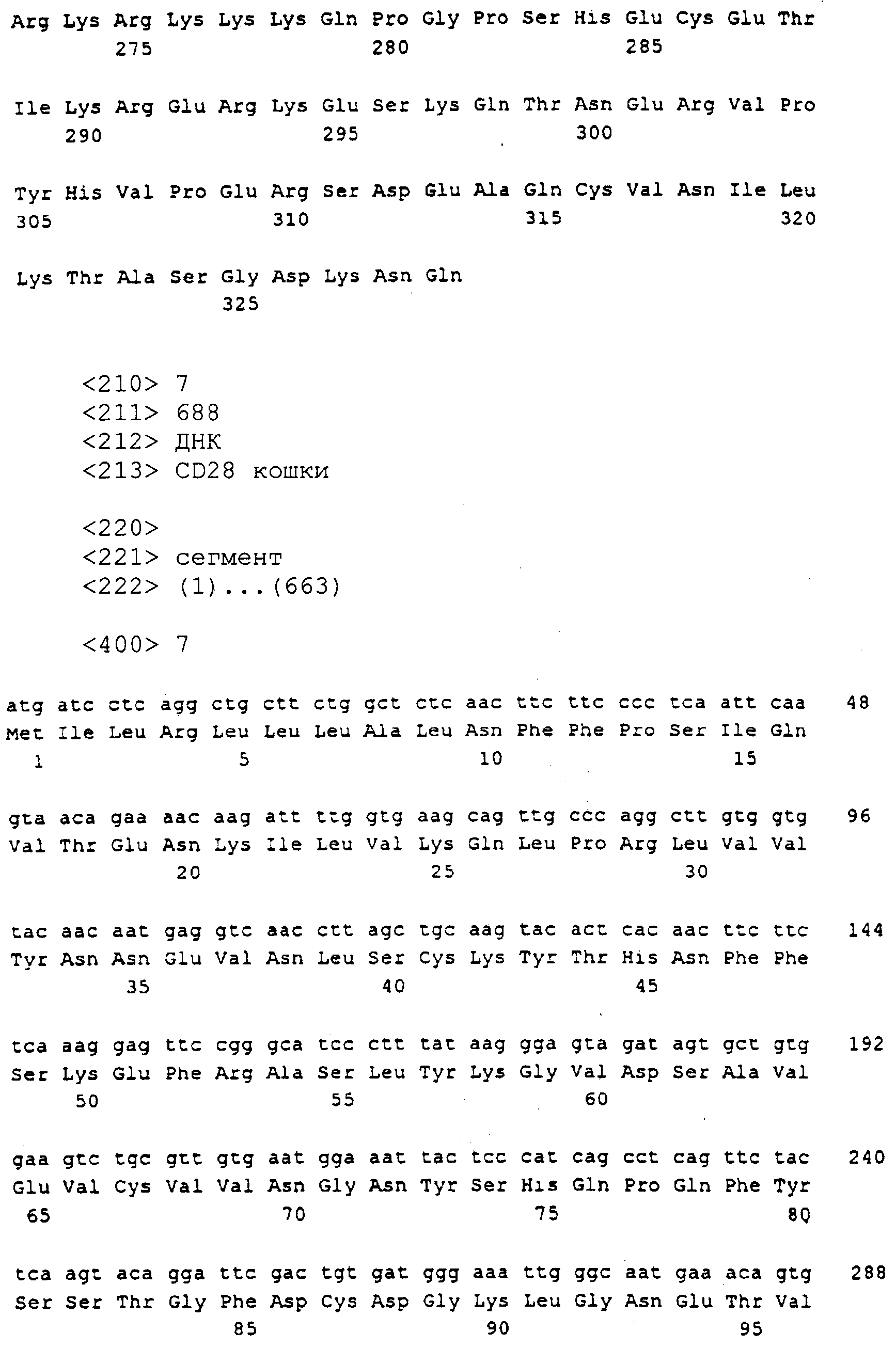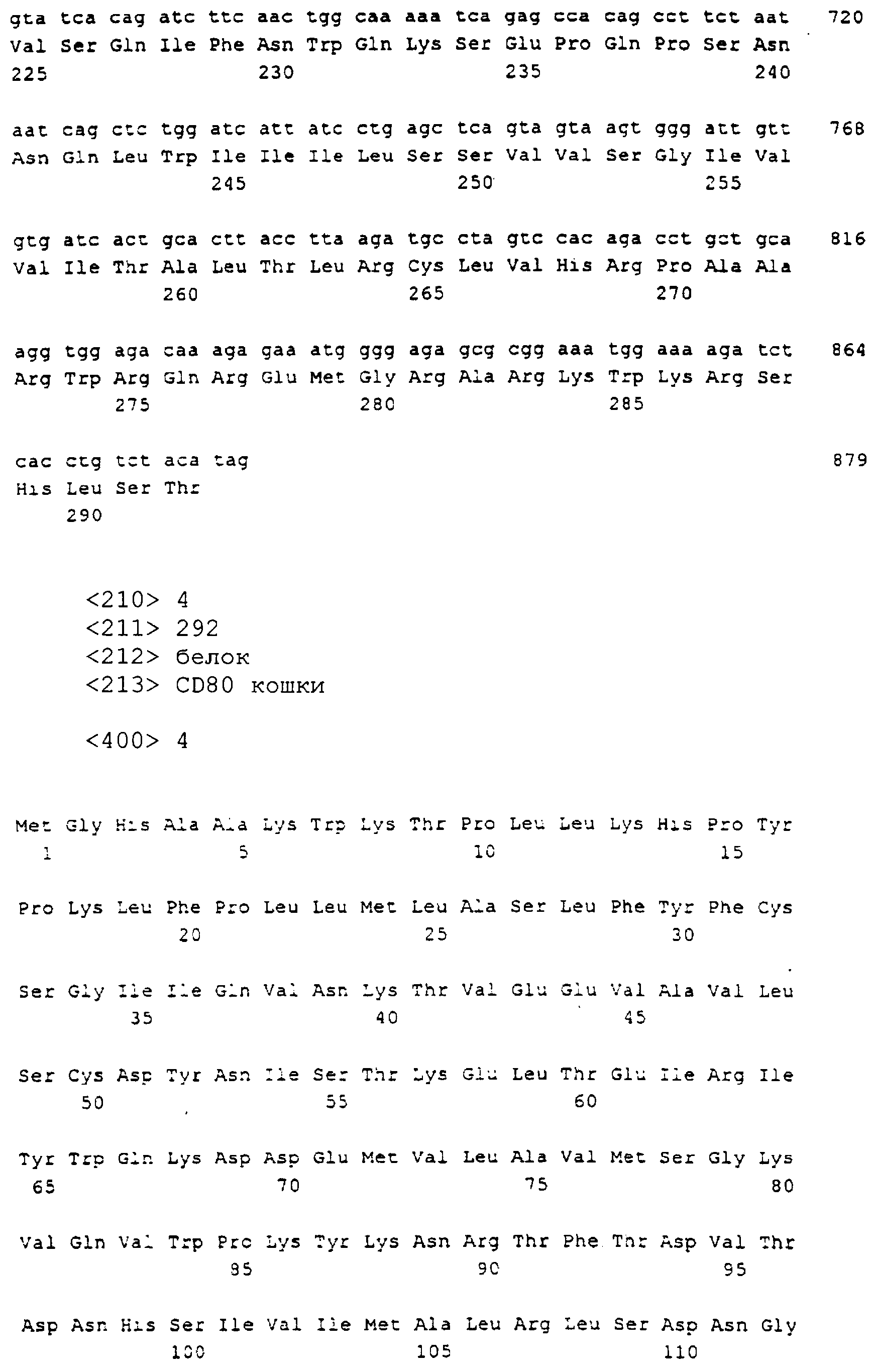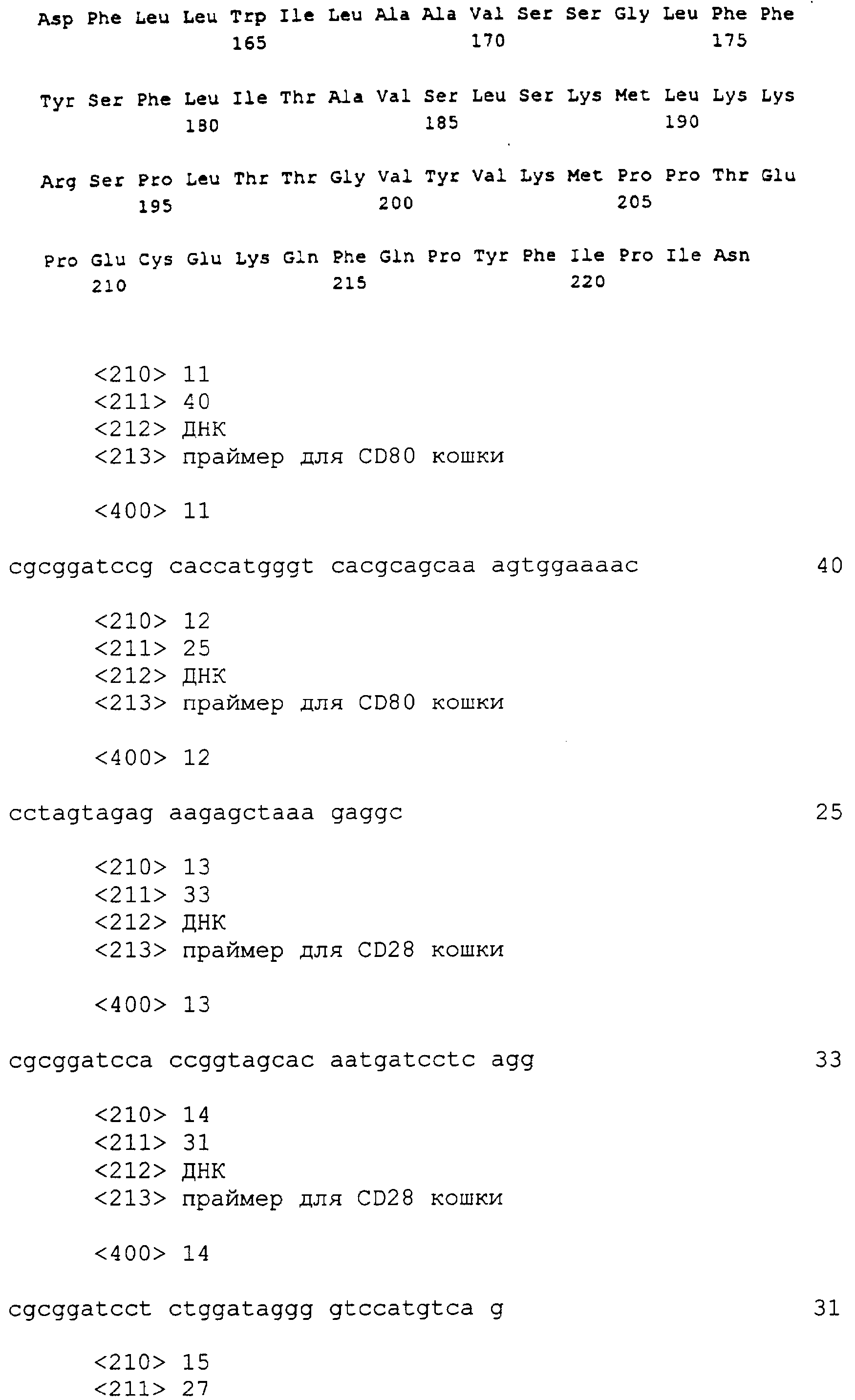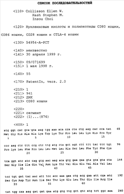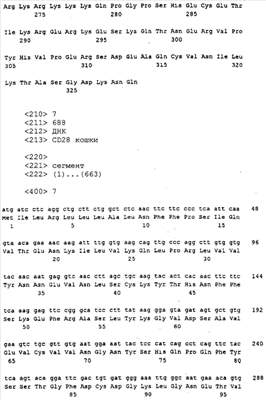Последовательности кДНК, кодирующие CD80 кошки (SEQ ID NO: 1), CD86 кошки (SEQ ID NO: 5), CD28 кошки (SEQ ID NO: 7) или CTLA-4 кошки (SEQ ID NO: 9), показаны на фиг. 1-5, а расшифрованные аминокислотные последовательности CD80 кошки (SEQ ID NO: 2), CD86 кошки (SEQ ID NO: 6), CD28 кошки (SEQ ID NO: 8) или CTLA-4 кошки (SEQ ID NO: 10) показаны на фиг. 1-5. Идентификация этих кошачьих полипептидов как CD80, CD86, CD28 или CTLA-4 основывается на определенном уровне гомологии аминокислотных последовательностей и гомологичных полипептидов человека или мыши, или кролика, и на способности полипептидов CD80 или CD86 связываться с рецептором CD28 кошки (см. ниже) или с CTLA-4 и активировать или стимулировать, или каким-либо иным образом регулировать активацию Т-лимфоцитов. Более того, не ограничиваясь какой-либо теорией, предсказывается, что полипептиды CD80 кошки или CD86 кошки также проявляют одну или большее число из следующих биологических активностей: активация клеток NK (нативные клетки-киллеры), стимуляция созревания В-клеток, активация ограниченных по МНС цитотоксических Т-лимфоцитов, пролиферация тучных клеток, взаимодействие с рецепторами цитокинов и индукция иммунорегулирующих цитокинов.