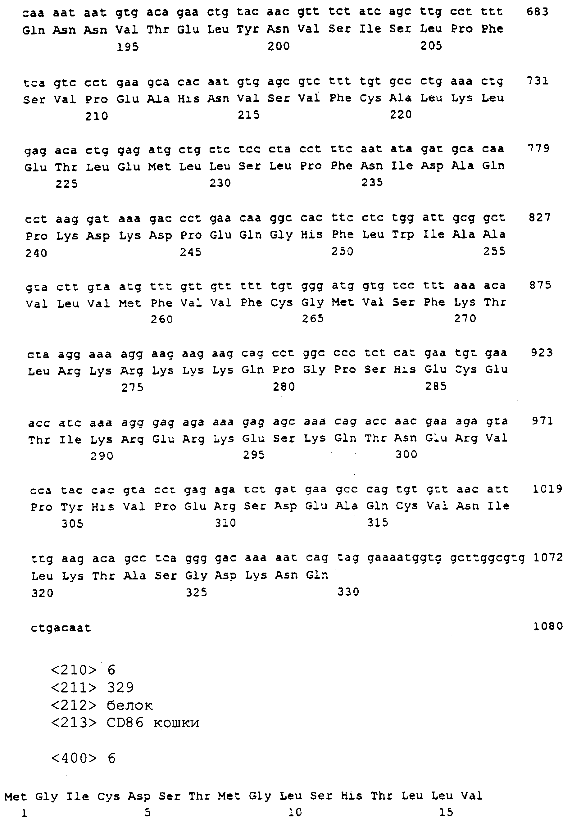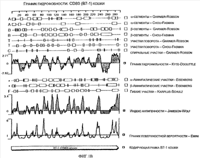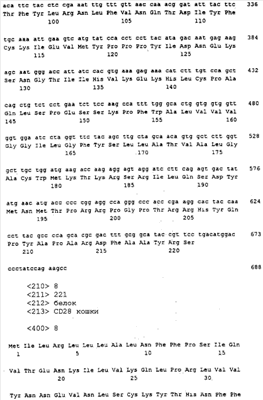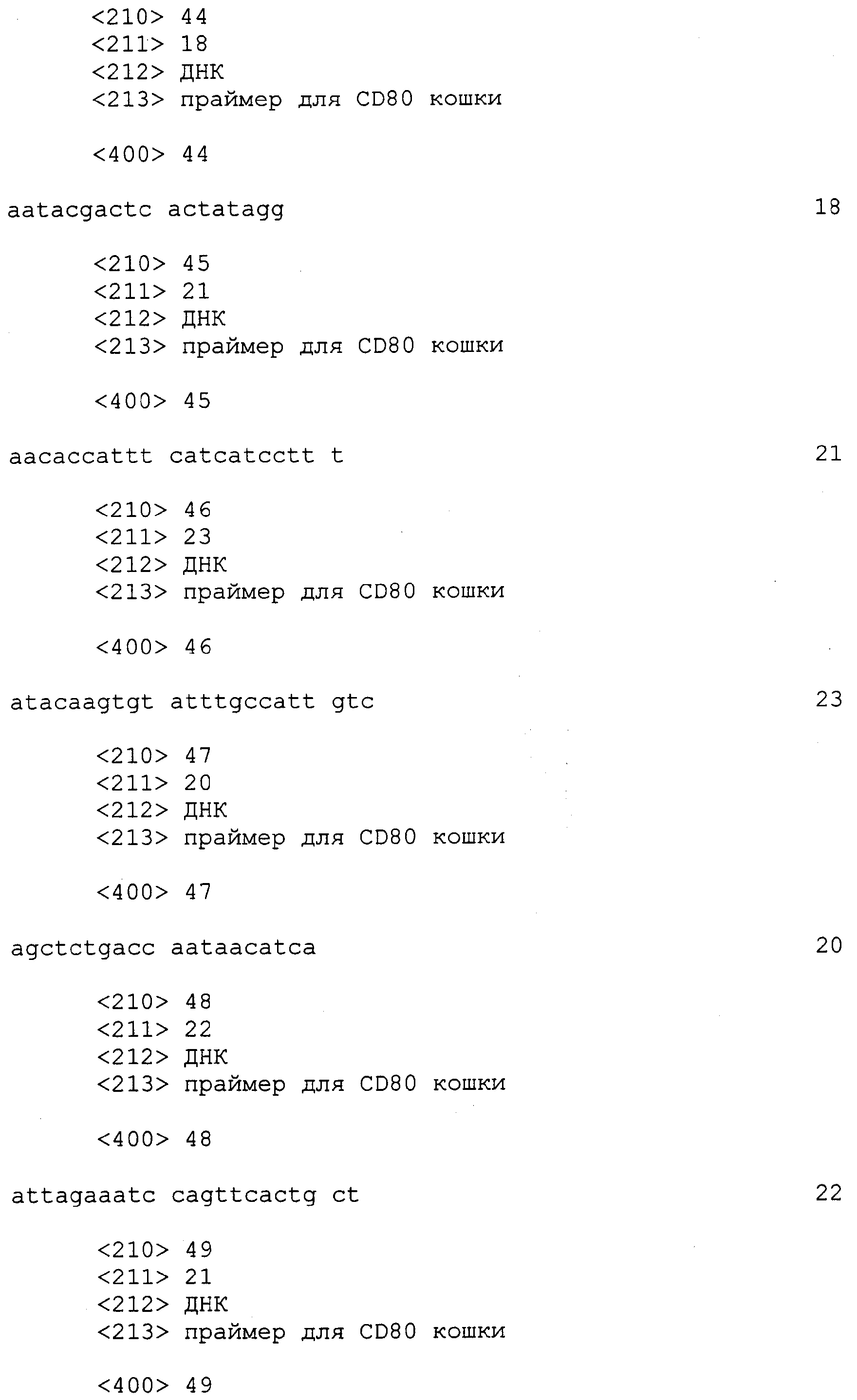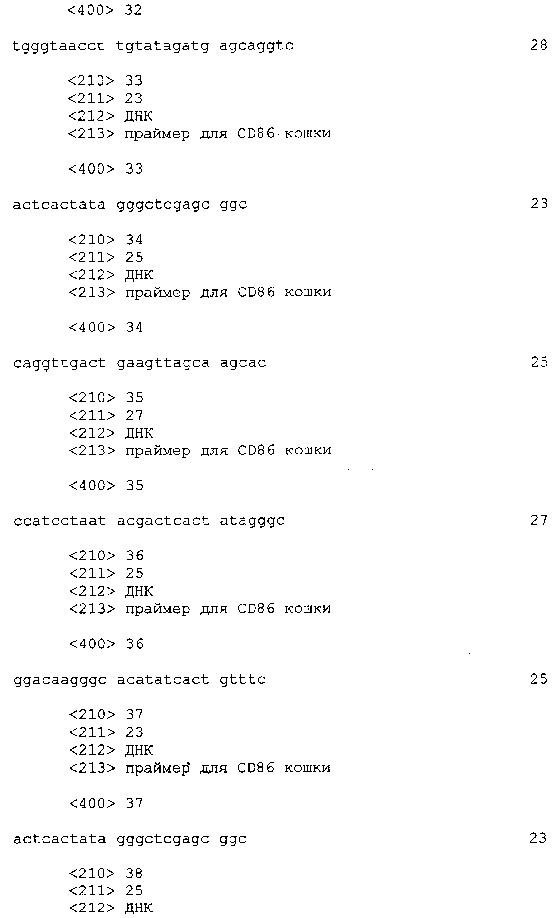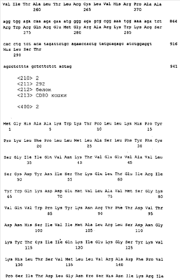 Последовательности кДНК, кодирующие CD80 кошки (SEQ ID NO: 1), CD86 кошки (SEQ ID NO: 5), CD28 кошки (SEQ ID NO: 7) или CTLA-4 кошки (SEQ ID NO: 9), показаны на фиг. 1-5, а расшифрованные аминокислотные последовательности CD80 кошки (SEQ ID NO: 2), CD86 кошки (SEQ ID NO: 6), CD28 кошки (SEQ ID NO: 8) или CTLA-4 кошки (SEQ ID NO: 10) показаны на фиг. 1-5. Идентификация этих кошачьих полипептидов как CD80, CD86, CD28 или CTLA-4 основывается на определенном уровне гомологии аминокислотных последовательностей и гомологичных полипептидов человека или мыши, или кролика, и на способности полипептидов CD80 или CD86 связываться с рецептором CD28 кошки (см. ниже) или с CTLA-4 и активировать или стимулировать, или каким-либо иным образом регулировать активацию Т-лимфоцитов. Более того, не ограничиваясь какой-либо теорией, предсказывается, что полипептиды CD80 кошки или CD86 кошки также проявляют одну или большее число из следующих биологических активностей: активация клеток NK (нативные клетки-киллеры), стимуляция созревания В-клеток, активация ограниченных по МНС цитотоксических Т-лимфоцитов, пролиферация тучных клеток, взаимодействие с рецепторами цитокинов и индукция иммунорегулирующих цитокинов.