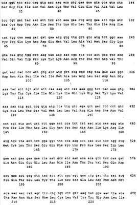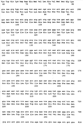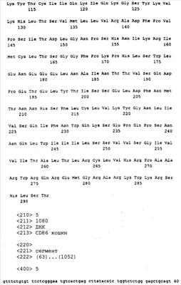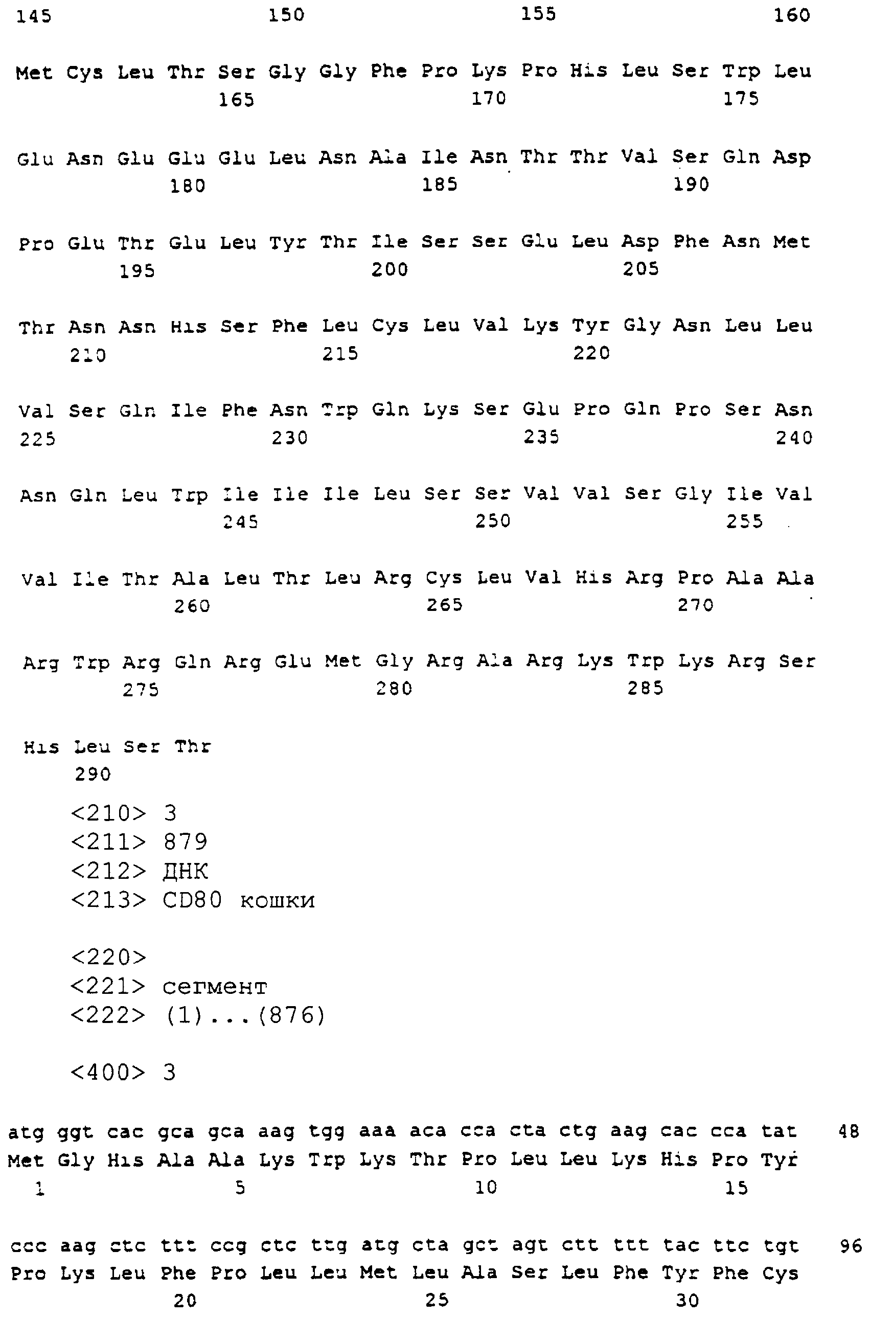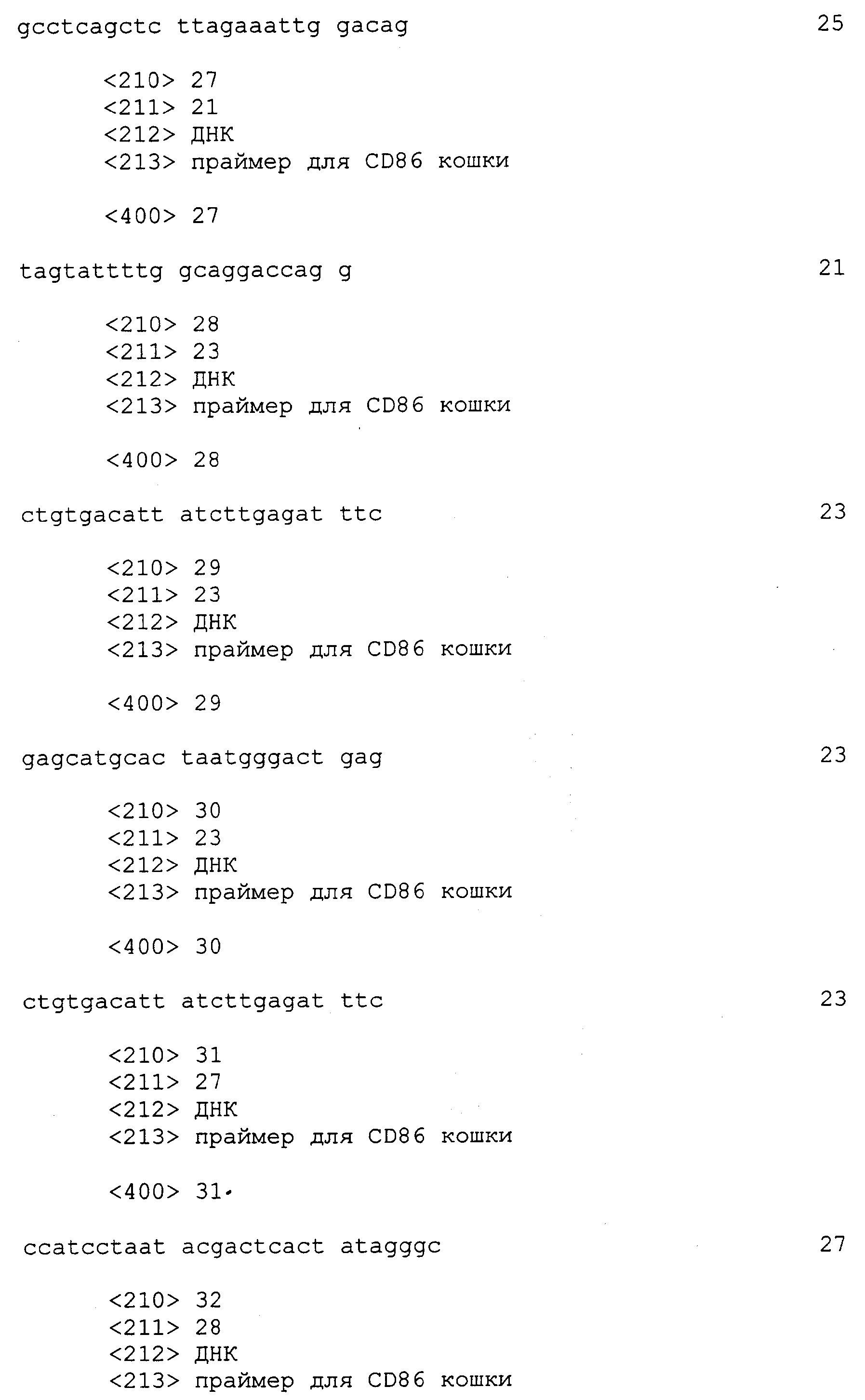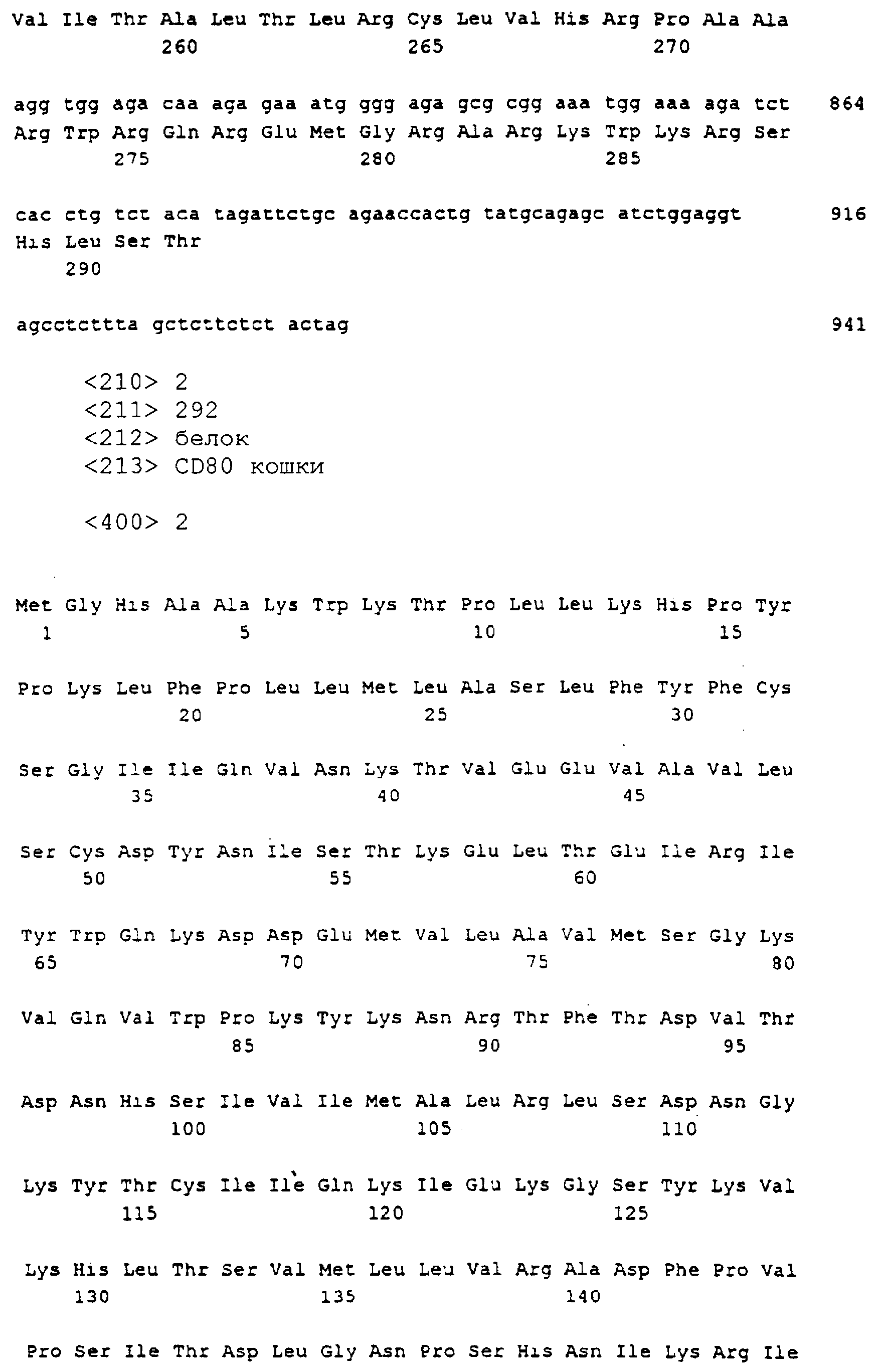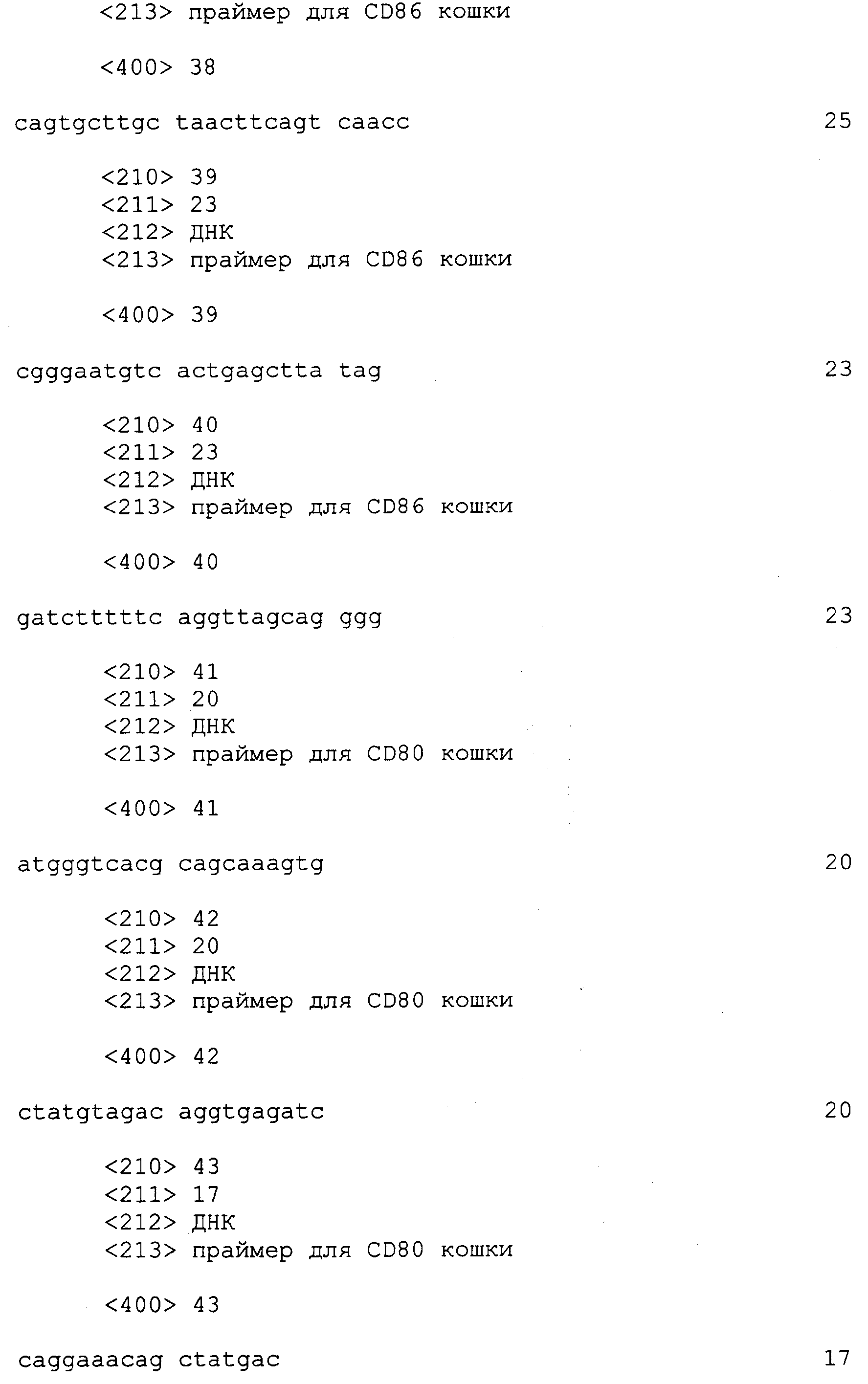 Последовательности кДНК, кодирующие CD80 кошки (SEQ ID NO: 1), CD86 кошки (SEQ ID NO: 5), CD28 кошки (SEQ ID NO: 7) или CTLA-4 кошки (SEQ ID NO: 9), показаны на фиг. 1-5, а расшифрованные аминокислотные последовательности CD80 кошки (SEQ ID NO: 2), CD86 кошки (SEQ ID NO: 6), CD28 кошки (SEQ ID NO: 8) или CTLA-4 кошки (SEQ ID NO: 10) показаны на фиг. 1-5. Идентификация этих кошачьих полипептидов как CD80, CD86, CD28 или CTLA-4 основывается на определенном уровне гомологии аминокислотных последовательностей и гомологичных полипептидов человека или мыши, или кролика, и на способности полипептидов CD80 или CD86 связываться с рецептором CD28 кошки (см. ниже) или с CTLA-4 и активировать или стимулировать, или каким-либо иным образом регулировать активацию Т-лимфоцитов. Более того, не ограничиваясь какой-либо теорией, предсказывается, что полипептиды CD80 кошки или CD86 кошки также проявляют одну или большее число из следующих биологических активностей: активация клеток NK (нативные клетки-киллеры), стимуляция созревания В-клеток, активация ограниченных по МНС цитотоксических Т-лимфоцитов, пролиферация тучных клеток, взаимодействие с рецепторами цитокинов и индукция иммунорегулирующих цитокинов.
