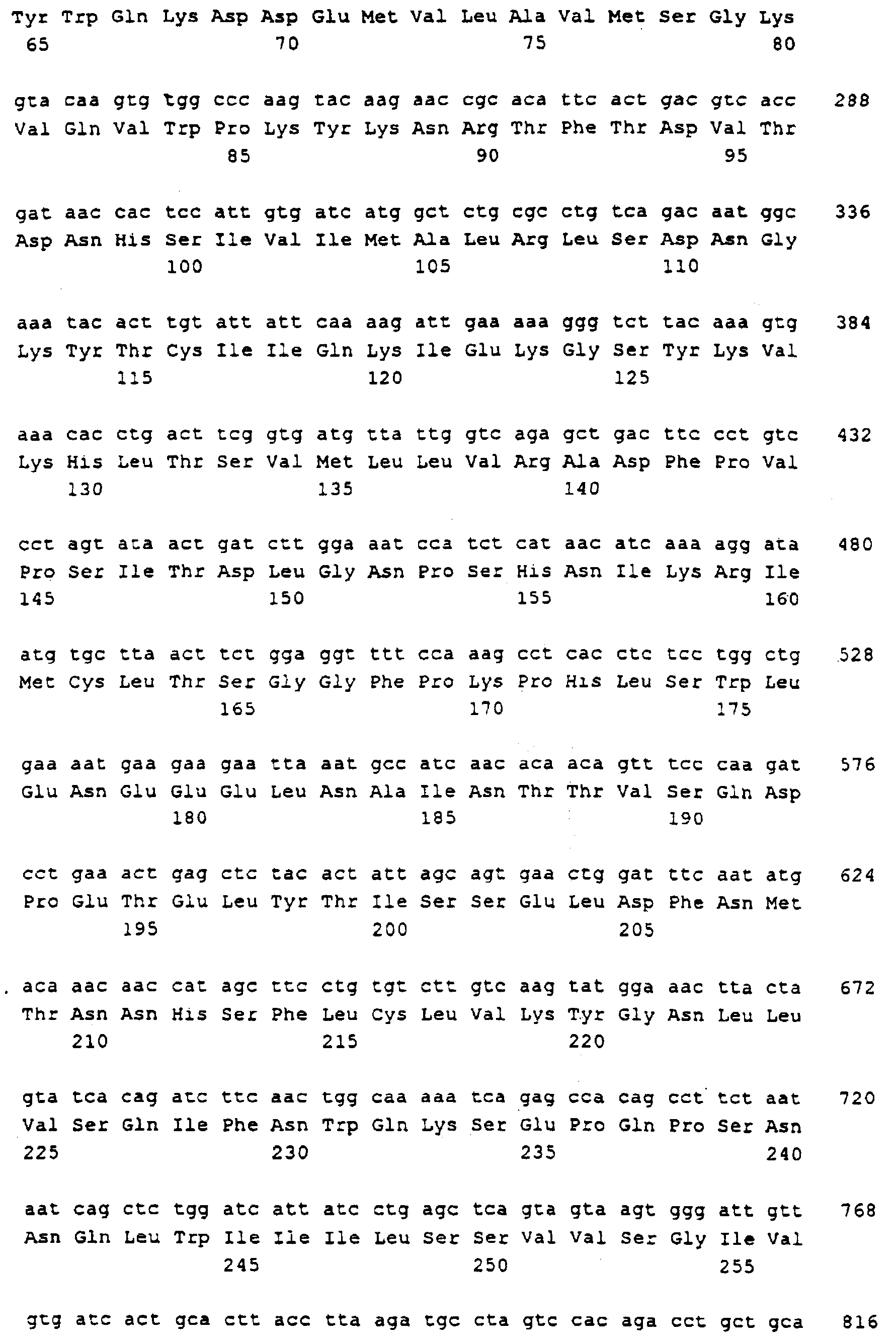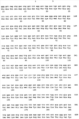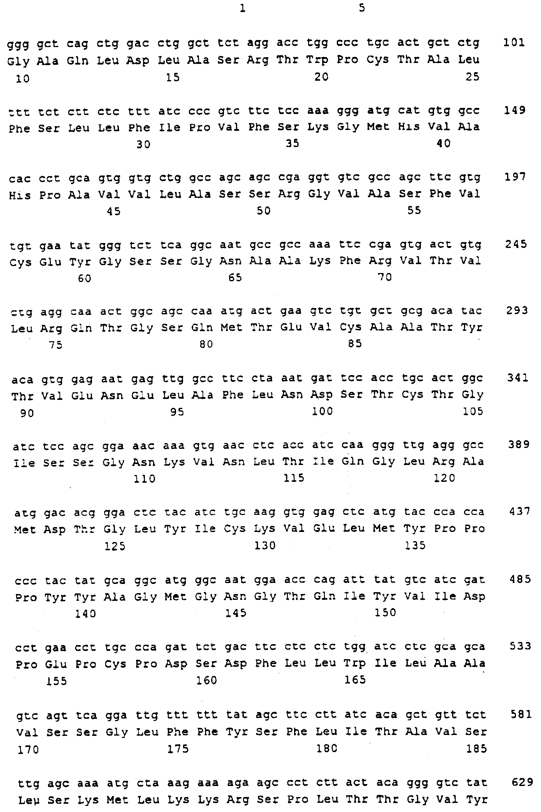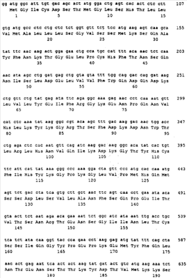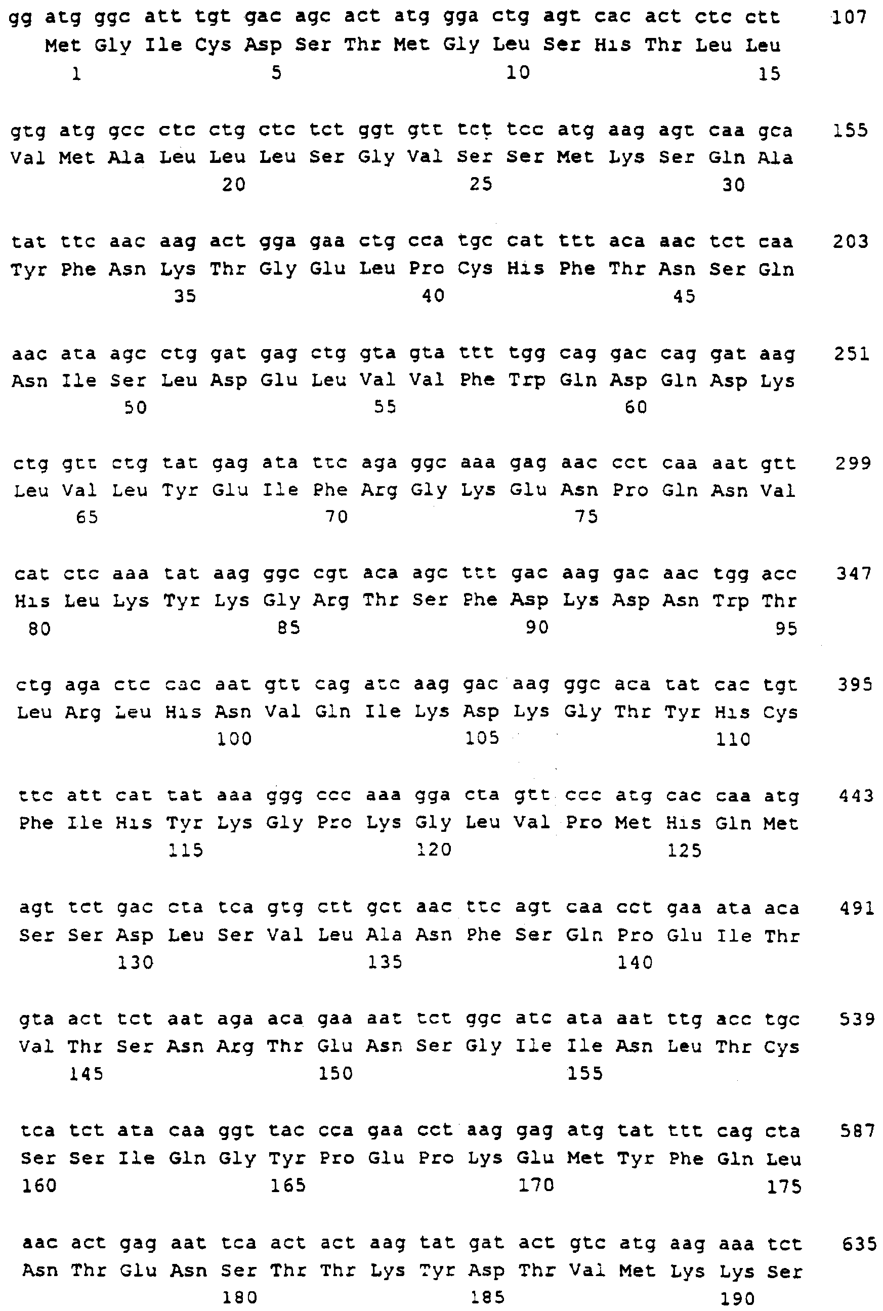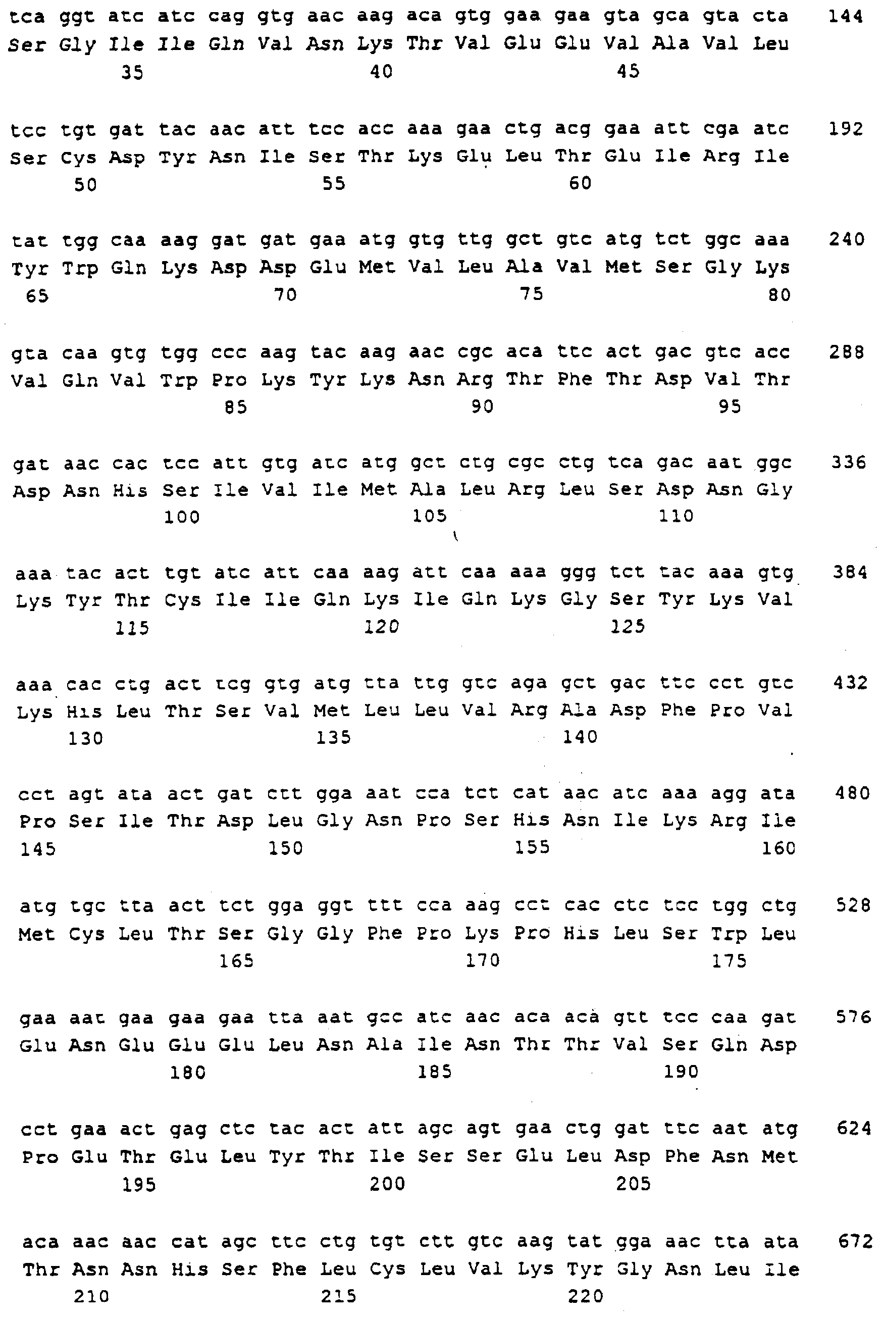 Последовательности кДНК, кодирующие CD80 кошки (SEQ ID NO: 1), CD86 кошки (SEQ ID NO: 5), CD28 кошки (SEQ ID NO: 7) или CTLA-4 кошки (SEQ ID NO: 9), показаны на фиг. 1-5, а расшифрованные аминокислотные последовательности CD80 кошки (SEQ ID NO: 2), CD86 кошки (SEQ ID NO: 6), CD28 кошки (SEQ ID NO: 8) или CTLA-4 кошки (SEQ ID NO: 10) показаны на фиг. 1-5. Идентификация этих кошачьих полипептидов как CD80, CD86, CD28 или CTLA-4 основывается на определенном уровне гомологии аминокислотных последовательностей и гомологичных полипептидов человека или мыши, или кролика, и на способности полипептидов CD80 или CD86 связываться с рецептором CD28 кошки (см. ниже) или с CTLA-4 и активировать или стимулировать, или каким-либо иным образом регулировать активацию Т-лимфоцитов. Более того, не ограничиваясь какой-либо теорией, предсказывается, что полипептиды CD80 кошки или CD86 кошки также проявляют одну или большее число из следующих биологических активностей: активация клеток NK (нативные клетки-киллеры), стимуляция созревания В-клеток, активация ограниченных по МНС цитотоксических Т-лимфоцитов, пролиферация тучных клеток, взаимодействие с рецепторами цитокинов и индукция иммунорегулирующих цитокинов.