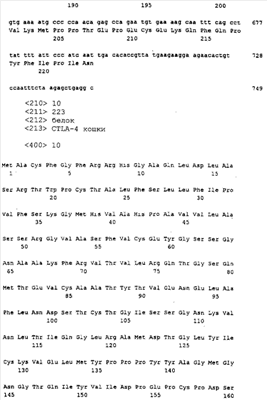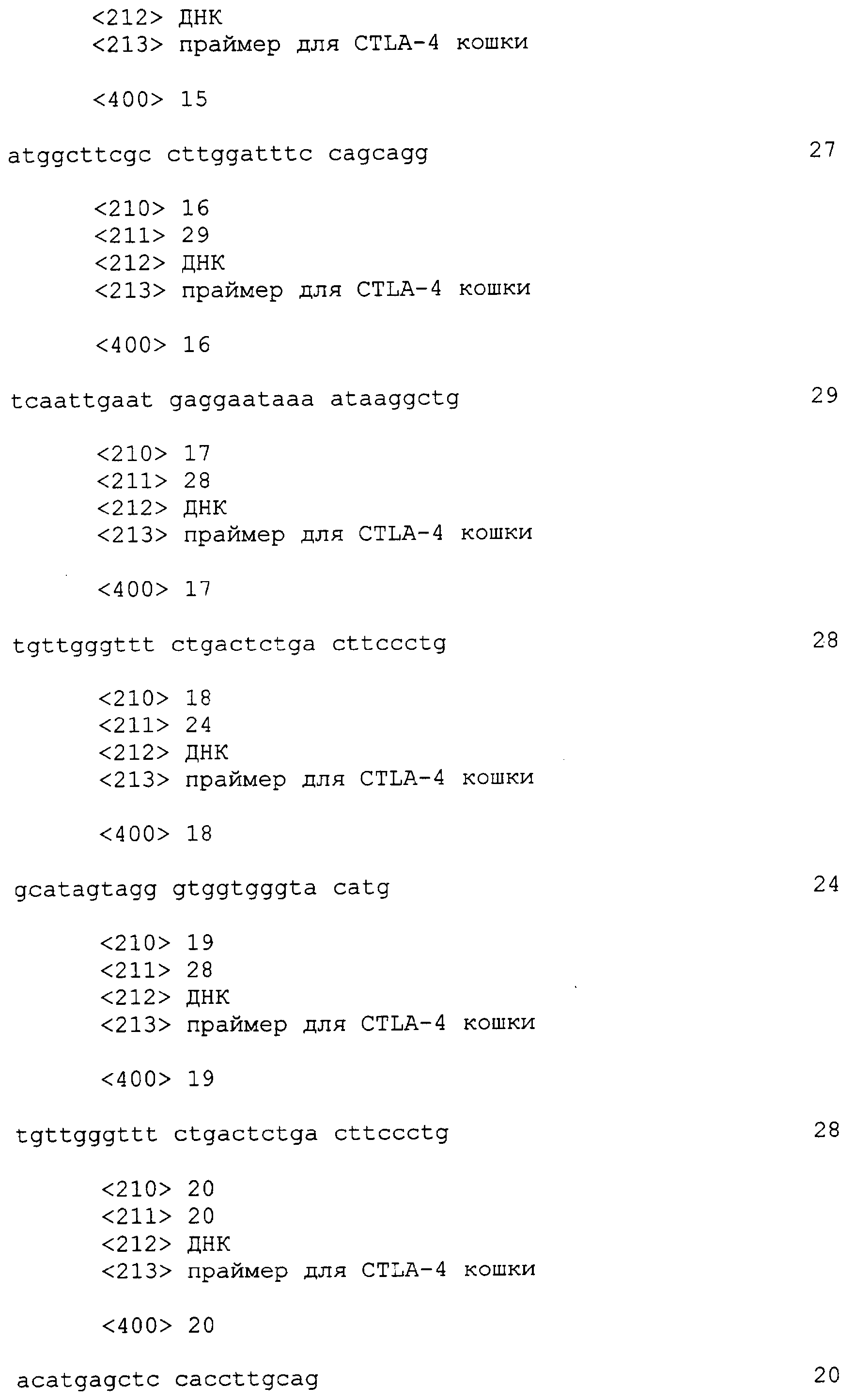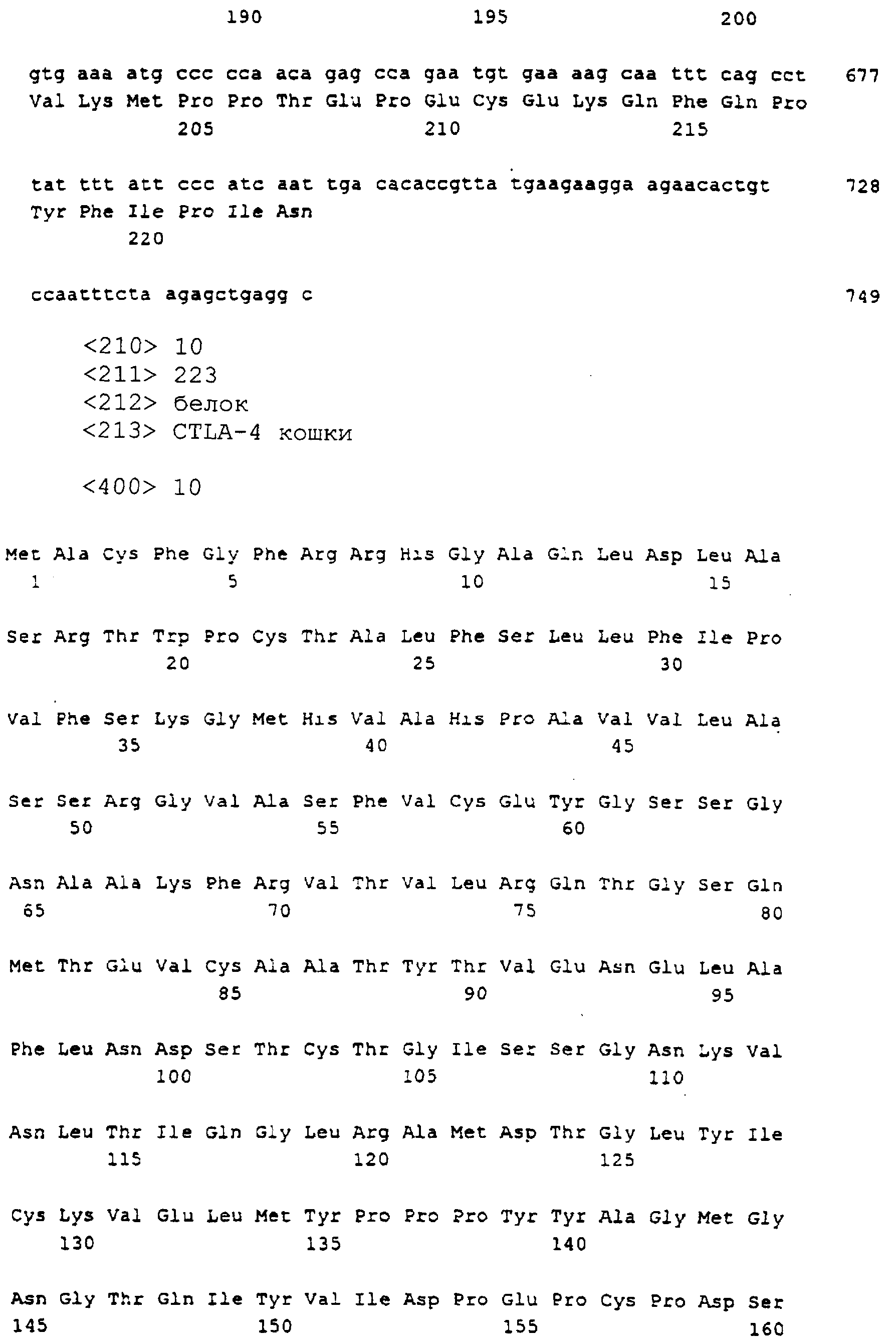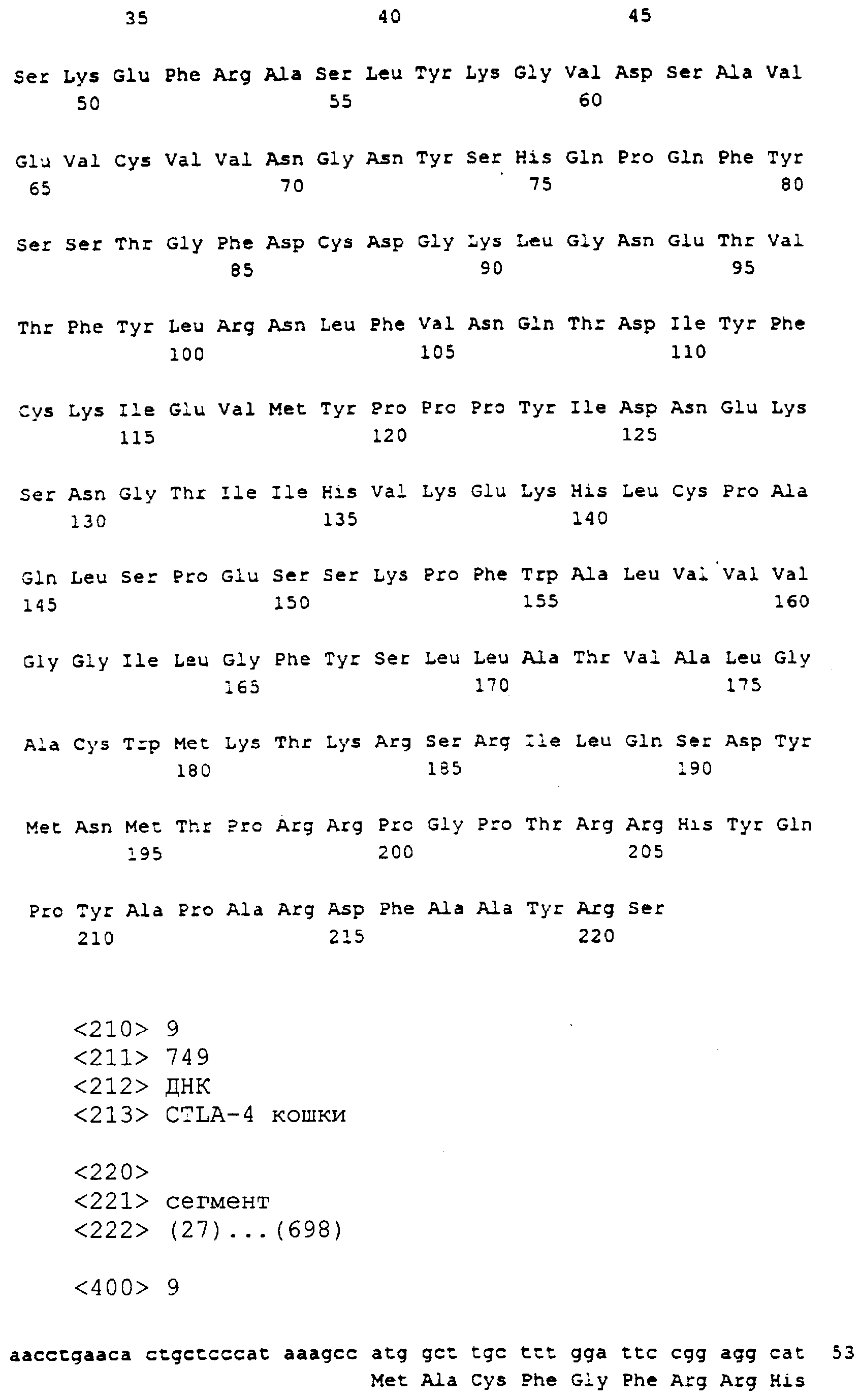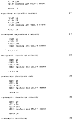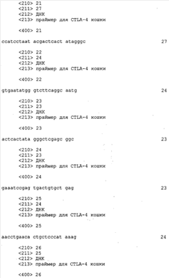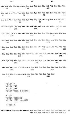 Также настоящее представляет выделенную и очищенную кДНК CTLA-4 длиной примерно 749 нуклеотидов. Также изобретение представляет выделенный и очищенный полипептид CTLA-4 кошки, состоящий примерно из 223 аминокислот, являющийся связанной с мембранной или зрелой формой с молекулярной массой 24,381 кДа, изоэлектрической точкой примерно pI=6,34 и суммарным зарядом при рН 7,0, равным -0,99.