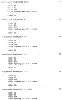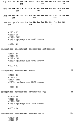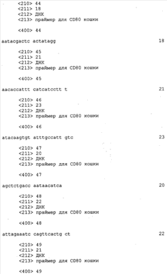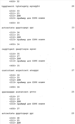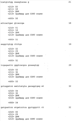 Настоящее изобретение охватывает последовательности кДНК и РНК в смысловом и антисмысловом порядках. Также изобретение охватывает последовательности геномной ДНК CD80, CD86, CD28 или CTLA-4 кошки и фланкирующие последовательности, включая, но тем самым не ограничиваясь, регуляторные последовательности. Нуклеиновые последовательности, кодирующие полипептиды CD80, CD86, CD28 или CTLA-4 кошки, также связывают с гетерологичными последовательностями, включая промоторы, энхансеры, регуляторные элементы, сигнальные последовательности, сигналы полиаденилирования, интроны, 5′- и 3′-некодирующие сегменты и подобное. Транскрипционными регуляторными элементами, которые функционально связаны с последовательностями кДНК CD80, CD86, CD28 или CTLA-4 кошки, являются без каких-либо ограничений последовательности, способные контролировать экспрессию генов, производные от прокариотических клеток, эукариотических клеток, вирусов прокариот, вирусов эукариот и любых их сочетаний. Также в данной области техники известны и другие гетерологичные регуляторные последовательности.