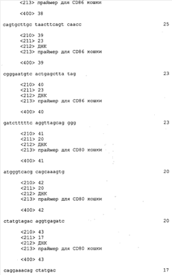 В другом аспекте настоящего изобретения представляется способ подавления иммунного ответа у кошки на иммуноген, что достигается введением этого иммуногена до, после или по существу одновременно с CD80 кошки или CD86 кошки вместе с CD28 кошки или CTLA-4 кошки или без них или с антисмысловой РНК или ДНК, частично или полностью кодирующих CD80 кошки или CD86 кошки, или CD28 кошки, или CTLA-4 кошки, в количестве, эффективном по подавлению иммунного ответа.
