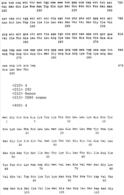 Подходящими векторами для использования в практике настоящего изобретения являются, тем самым не ограничиваясь, YEp352, pcDNAI (Invitrogen, Carlsbad, CA), pRc/CMV (Invitrogen) и pSFV1 (Gibco BRL), Gaithersburg, MD). Одним из предпочтительных по использованию в настоящем изобретении вектором является pSFV1. Подходящими клетками-хозяевами являются клетки E.coli, клетки дрожжей, клетки COS, клетки РС12, клетки СНО, клетки GH4C1, клетки ВНК-21 и клетки меланофоров амфибий. Клетки ВНК-21 являются предпочтительными клетками-хозяевами с точки зрения использования в практике настоящего изобретения. Подходящими векторами для конструирования «голой» ДНК или для «генетической вакцинации» являются, тем самым не ограничиваясь, pTarget (Promega, Madison, WI), pSI (Promega, Madison, WI) и pcDNA (Invitrogen, Carlsbad, CA).