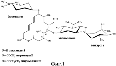 Спирамицин представляет собой антибиотик семейства макролидов, пригодный как в ветеринарии, так и в медицине. Макролиды характеризуются наличием лактонового цикла, к которому привиты один или несколько сахаров. Streptomyces ambofaciens в нативном состоянии продуцирует спирамицины I, II и III (см. фиг.1), однако, антибиотическая активность спирамицина I отчетливо выше таковой спирамицинов II и III (Liu и др., 1999). Молекула спирамицина I образована лактоновым макроциклом, называемым платенолидом, и тремя сахарами: форозамином, микаминозой и микарозой (см. фиг.1). Антибиотическая активность спирамицинов возникает вследствие ингибирования протеинового синтеза в прокариотах за счет механизма, приводящего к связыванию антибиотика с бактериальной рибосомой.