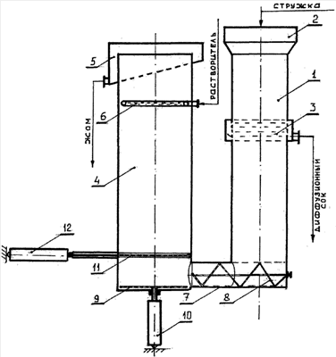 Аппарат состоит из двух вертикальных колонн. Колонна 1 снабжена устройством 2 для загрузки стружки и устройством 3 для отвода диффузионного сока 3. Колонна 4 снабжена устройством 5 для выгрузки жома и устройством 6 подачи растворителя. Колонны в нижней части соединены горизонтальной трубой 7. В этой трубе установлен шнек 8 с перфорированными витками. Нижняя часть колонны 4 снабжена дренажным диском 9, приводимым в движение по вертикали при помощи гидроцилиндра 10. Над дренажным диском 9 расположена перфорированная задвижка 11, которая может вводиться в колонну и выводиться из нее при помощи гидроцилиндра 12.