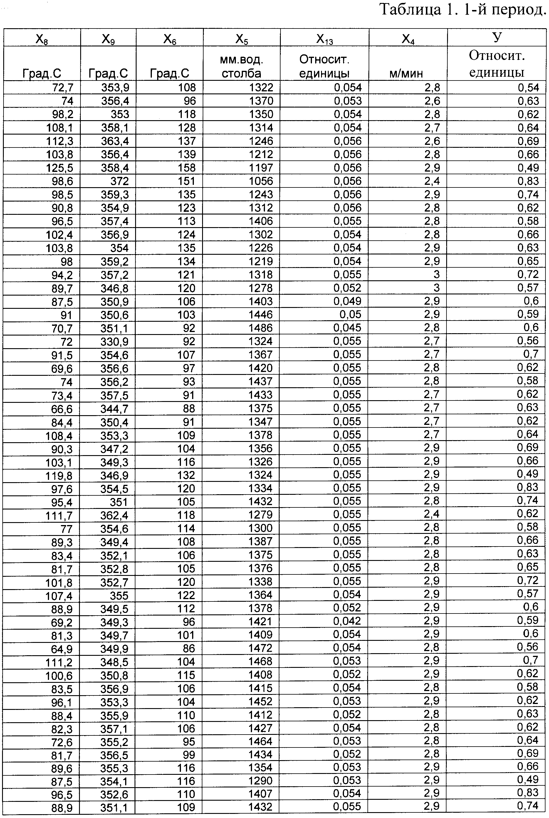где МА – масса спека агломерата после грохочения, т/ч; МШ – масса сырой шихты, поступающей на агломерацию, т/ч; x1 (В) – расход собственного возврата, относительные единицы; х2(О) – расход доменного возврата, относительные единицы; х3 (К) – расход коксовой мелочи, относительные единицы; x4 (V) – скорость движения спекательных тележек, м/мин;х5 (Рк) – давление газа в коллекторе, мм вод. ст.; х6 (Тк) – температура газа в коллекторе, °С; х7 (W) – влажность шихты, загружаемой на агломашину, %; х8 (TL-1) – температура в предпоследней вакуум-камере, °С; х9 (TL) – температура в последней вакуум-камере, °С; х10 (H) – скорость вращения окомкователя, об/мин; х11 (ЖР1) – расход концентрата 1, относительные единицы; x12 (ЖР2) – расход концентрата 2, относительные единицы; х13 (ЖРN)- расход концентрата N, относительные единицы.