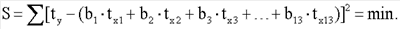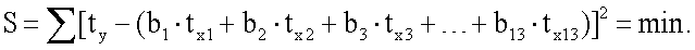 Запишем систему уравнений для определения параметров зависимости у от х1, х2, ,х13