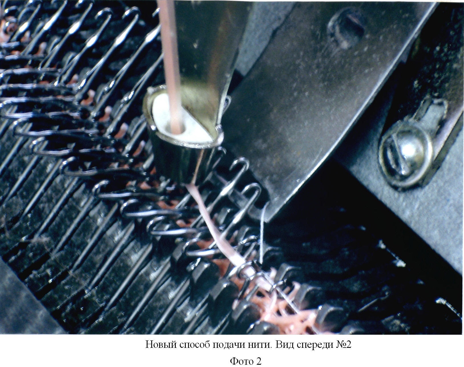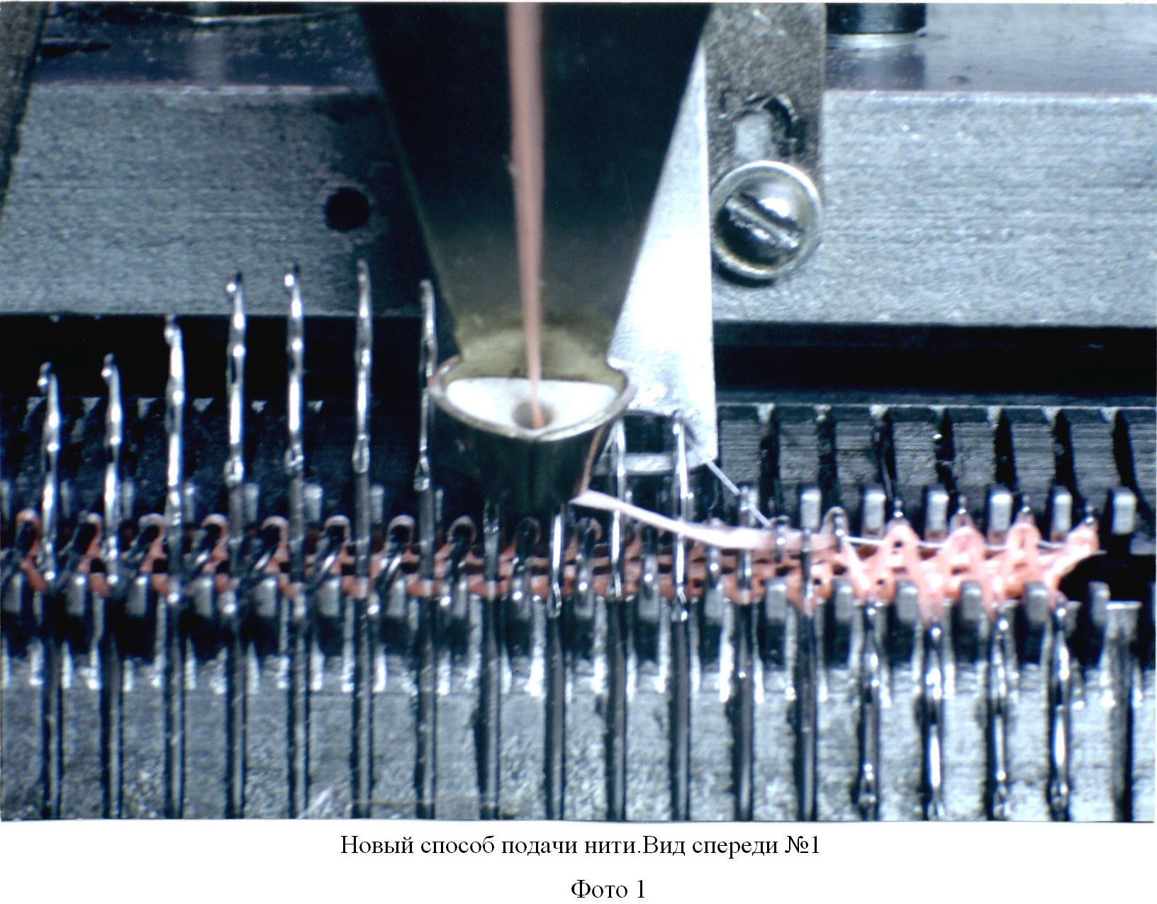 Изобретение поясняется чертежом, на котором представлена схема подачи нити на двухфонтурной плосковязальной машине. Позициями на чертеже обозначены: 1 – фонтуры плосковязальной машины, 2 – иглы, 3 – нитеводитель, 4 – дополнительный нитеводитель, 5 – первая нить, 6 – вторая нить. Также изобретение поясняется фотографиями, где на Фото 1 представлена плосковязальная машина, вид сбоку, на Фото 2 – плосковязальная машина, вид спереди.
