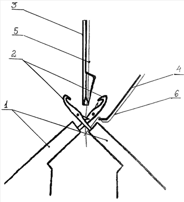 Возможность подачи второй нити 6 на плосковязальном станке осуществляется путем добавления в конструкцию плосковязального станка дополнительного нитеводителя 4 со стороны передней или задней фонтуры таким образом, чтобы нить, подаваемая через него в ходе движения вяжущей каретки, могла быть доступна только иглам одной из фонтур. Данный нитеводитель может быть выполнен в нескольких вариантах, которые объединены единым функциональным назначением. Основным условием работоспособности данного элемента является максимально близкое его расположение к иглам и фонтуре.