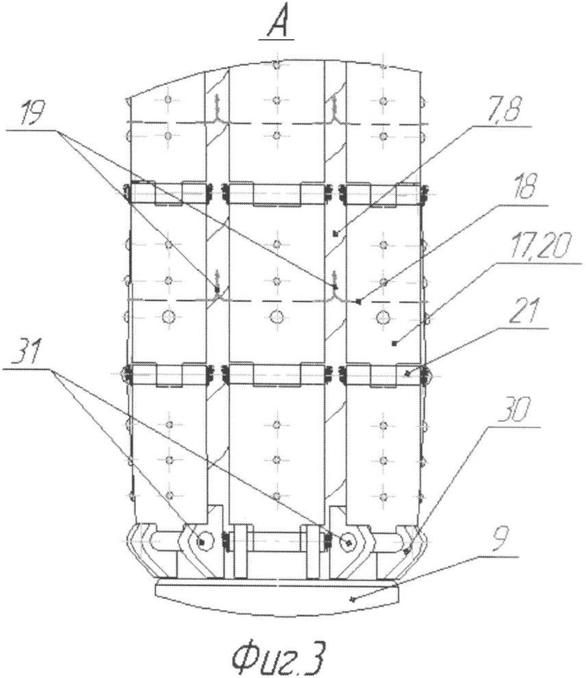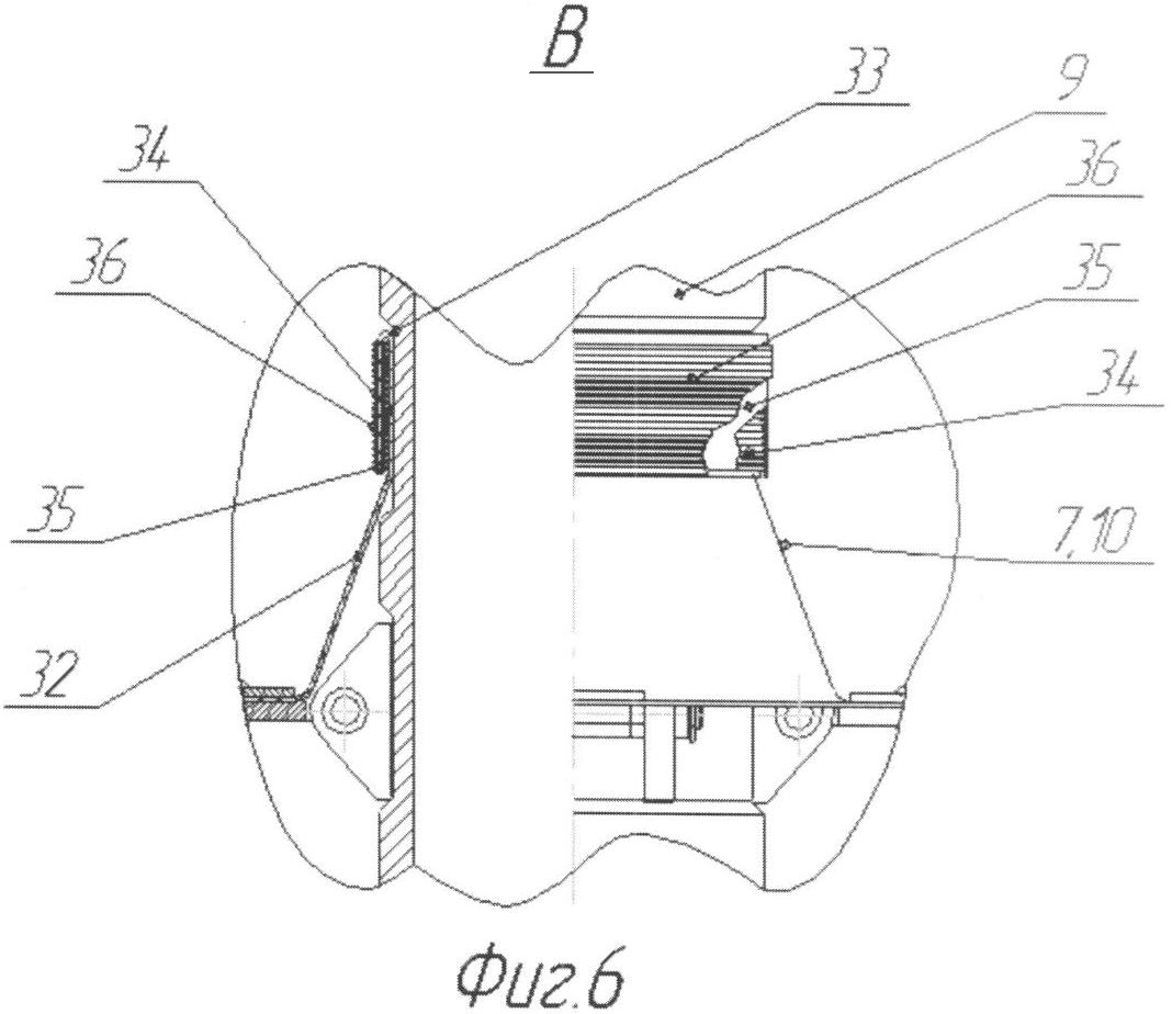 Многозвенные ленты 17 в радиальном направлении закреплены на несущей трубе 9 при помощи шарниров 30 и могут свободно поворачиваться вокруг осей 31, которые закреплены в шарнирах 30 любым известным способом (например, стопорными шайбами или развальцовкой). Нижняя горловина 32 оболочки 7 (фиг.6) закреплена на проточке 33, выполненной в нижней части несущей трубы 9, витками вязальной проволоки 34. При этом свободная часть 35 горловины 32 завернута вниз на витки проволоки 34 и поверху обвязана витками вязальной проволоки 36 или любым другим способом таким образом, чтобы общий габарит компоновки позволял свободно проходить через техническую колонну 4. В верхней части оболочки 7 расположено одно или несколько отверстий 37 (фиг.2), обеспечивающих гидравлическую связь ее внутреннего объема с окружающим пространством. На несущей трубе 9 размещена скоба 38, на которой закреплены гибкие тяги или стропы 39, нижние концы 40 которых закреплены на многозвенных лентах 17 и удерживают их в открытом положении 10.