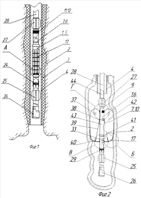 Выше проточки 33 на несущей трубе 9 выполнены радиальные отверстия 41, которыми гидравлически связываются между собой внутренняя полость 42, образованная оболочкой 7, центральный проходной канал 43 несущей трубы 9 и через него центральный проходной канал 44, образованный колонной труб 28.