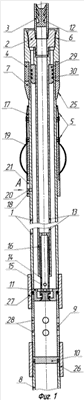 Далее устройство в транспортном положении (направляющий штифт 20 находится в нижней части короткой проточки 22 сквозного фигурного паза 21, как показано на чертеже) на транспортировочной колонне 3 спускают в скважину, периодически производя долив жидкости в трубы транспортировочной колонны 3.