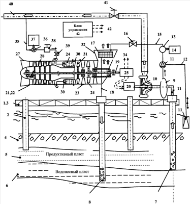 Приводится в действие насос для перекачки углеводородов 10, который повышает давление добываемого продукта (углеводородов) в основной магистрали 40. Одновременно насос 13 забирает воду или из водоема или из сепаратора 9, в зависимости от положения трехходового крана 11 и по трубопроводу подачи воды 15 через управляемый клапан 16 вода поступает в теплообменник 17, где подогревается выхлопными газами, выходящими из газотурбинного привода 21 в выхлопное устройство 33, и далее по трубопроводу подачи горячей воды 18 поступает в нагнетательную скважину 1. Давление в продуктивном пласте 5 повышается. При наличии твердых газогидратов они расплавляются и становятся пригодными для отбора в добывающих скважинах.