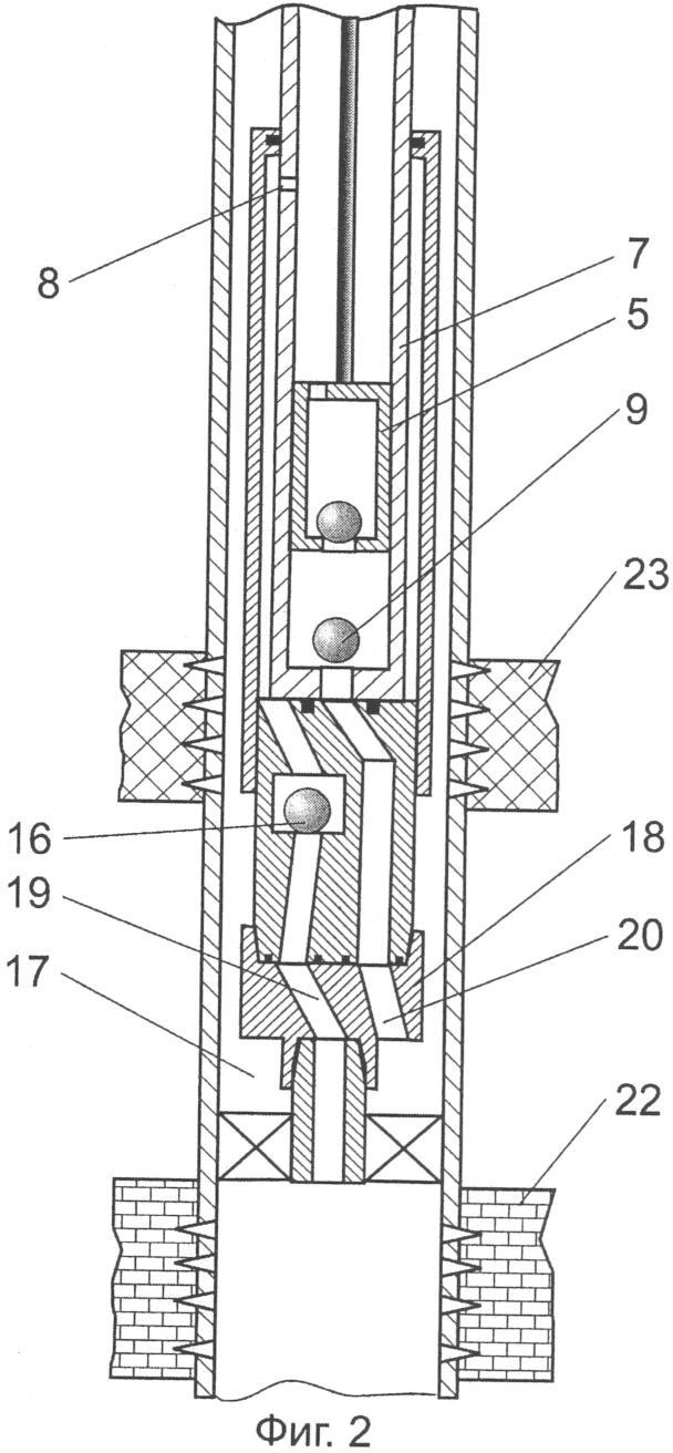 В случае если, наоборот, забойное давление нижнего пласта 22 выше, чем у верхнего 23, поворотом барабана 18 (см. фиг.2) на 180° перед монтажом установки сообщают основной клапан 9 с межтрубным пространством 17, а отверстие 8 и дополнительный клапан 16 – через хвостовик 3 с нижним пластом 22.