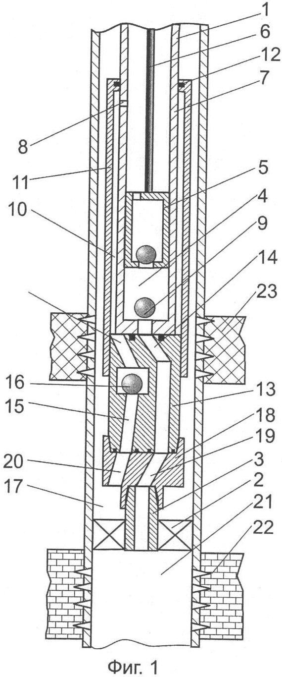 При ходе вниз жидкость в цилиндре 7 насоса 4 перетекает через плунжер 5, и при следующем ходе все повторяется вновь, а продукция пластов 22 и 23 перекачивается вверх по колонне лифтовых труб 1.