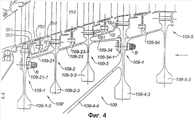 Моноблок 109′ только с лопатками ступени 109-2 устанавливается и прикрепляется болтом прямо к диску 109-1-3. Как можно видеть, лопатки ступени 109-2 опираются на ребро 131-3 межступенчатого кольца 131. Крюки на хвостовиках лопаток располагаются на верхней по потоку стороне, опирающейся на венец диска так, что хвостовики фиксируются против всех осевых движений.