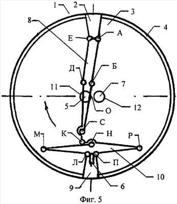 В исходном положении кривошип с шарниром К вала коленчатого относительно оси О повернут вертикально вниз (фиг.1). Шатуны БС, ДК, коромысла АБ, ДЕ расположены вертикально, сближены и образуют замкнутую полость 8 минимального объема. Относительно оси О вращения впускной канал 11 с впускным клапаном 5 расположен слева, а выпускной канал 12 с выпускным клапаном 7 расположен справа. Клапаны 5 и 7 открыты и совмещены с полостью 8. Полость 8 сообщена с атмосферой через впускной канал 11 с открытым впускным клапаном 5 и через выпускной канал 12 с открытым выпускным клапаном 7. В объем полости 8 через впускной канал 11 и открытый впускной клапан 5 поступает свежая горючая смесь (воздушный заряд у дизеля), а отработавшие газы вытесняются из нее через открытый выпускной клапан 7 и выпускной канал 12 в атмосферу.