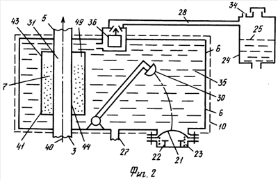 Из расширительного бака 24, расположенного на расстоянии 19 выше верхнего бачка радиатора 33 системы охлаждения и теплового гидроаккумулятора 6, рабочая жидкость 8 самотеком через кран 32, открытый электромагнитный клапан 18, заполнит пространство 35. Поплавок 36 всплывает. Связь пространства 35 через трубопровод 28 с расширительным баком 24 прекращается. Расстояние 20 увеличивается, а уровень 25 понижается, причем частично. Рабочая жидкость, соприкасаясь с наружными стенками 44 теплообменника 41, интенсивно нагревается. Вещество 7 при этом постепенно охлаждается.