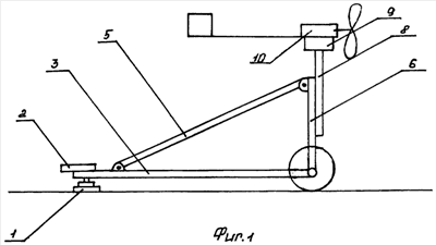 Ветроэнергетическая установка работает следующим образом. После прибытия на место развертывания дышло прицепа закрепляется с помощью домкрата 1. Колеса стопорятся. В случае складного варианта стойки 7 и 8 поднимаются и фиксируются относительно ребер 3 и 4 и ребра (оси 11) с помощью ребра укоса 5. Кроме этого может быть произведено, в случае необходимости, дополнительное заякоривание башни. Под воздействием ветрового потока лопасти колеса вращаются, генератор, установленный в головке 10, вырабатывает электроэнергию, колесо ориентируется на ветер с помощью хвоста и поворотного основания 9.
