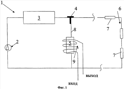В соединительном узле, который расположен между главным 6 и дополнительным 8 контурами и от которого ответвляются участки трубопровода, параллельные участку контура, в котором расположены элементы 7, расположен трехходовой клапан 4 с сервоприводом.