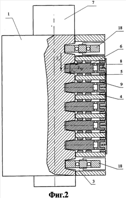 Оси вращения роликов 6 продольного нагружения расположены поперек (приблизительно перпендикулярно) центральной оси корпуса. Согласно изобретению, ролики 6 продольного нагружения установлены с возможностью ограниченного смещения вдоль своей оси вращения в ответ на изменение воздействующей на них со стороны винта нагрузки (радиальной составляющей), предпочтительно с равномерным распределением этой нагрузки между роликами. Подобная установка роликов может быть осуществлена различными путями с использованием пружинных, гидравлических и других средств. Наиболее подходит для этого гидросистема, которая и проиллюстрирована в представленном примере осуществления изобретения. Как показано на фиг.2 и 3, в торце каждого ролика 6 продольного нагружения установлен опорный подшипник 8 качения, опирающийся на гидравлический поршень 9, включенный в единую систему гидрокомпенсации нагрузки роликов продольного нагружения.