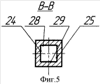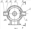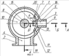 Расходные отверстия выходных патрубков и заслонок выполнены в форме прямоугольника, у которого одна пара сторон 24 и 25 перпендикулярна оси 8 вала 6. Торцевые поверхности 26 и 27 заслонок выполнены параллельно сторонам 28 и 29 отверстий выходных патрубков (фиг.5). В радиальной плоскости, перпендикулярной оси вала, длина отверстий заслонок и выходных патрубков одинакова, а взаимосвязь заслонок и расходных отверстий выходных патрубков в радиальном сечении определяется эмпирически полученными соотношениями: