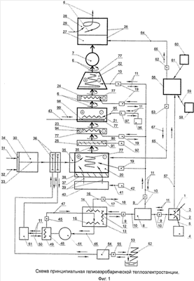 8. Гелиоаэробарическая теплоэлектростанция по п.1, отличающаяся тем, что в названном теплоаккумуляторе установлен второй теплообменный агрегат, размещенный в нем посредством установки трубопроводов, которые соединены в коллектор с помощью подводящей гидромагистрали и отводящего паропровода, за счет чего данный теплообменный агрегат включен во второй контур производства электроэнергии, содержащий паротурбогенератор, холодильник-конденсатор и насосный агрегат подачи жидкого рабочего тела, преимущественно, легко испаряемой жидкости, при этом насосный агрегат подключен гидравлическим каналом к подводящей гидромагистрали теплообменного агрегата, а паротурбогенератор соединен своим входом с отводящим паропроводом последнего и выходом – с холодильником, к которому подведен канал охлаждения, подключенный своим выходом к тепловому преобразователю как источник тепловой энергии с пониженной температурой, а тепловой отвод теплового преобразователя со значительно увеличенной температурой рабочего тела термодинамически присоединен по меньшей мере к одному вспомогательному теплогенератору как приемнику тепловой энергии, установленному в ветровоздухозаборном канале.