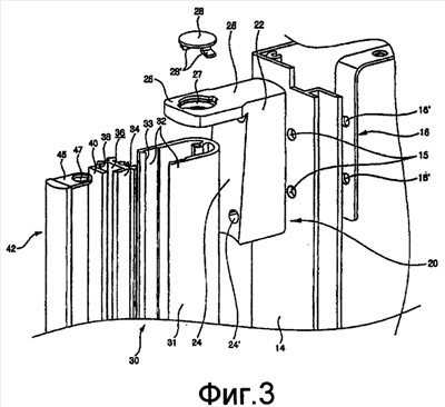 Кроме того, стержни элементов отделки (не показаны) образуют боковые поверхности и верхнюю и нижнюю поверхности двери 10. Среди стержней элементов отделки имеется боковой стержень 14 элемента отделки, определяющий одну боковую поверхность и защищающий участок края передней панели 12. Сквозные отверстия 15 образованы в участках бокового стержня 14 отделочного элемента, который защищает край передней панели 12, чтобы устанавливать держатели 20 ручек, которые будут пояснены позже. Крепежные скобы 16 со сквозными отверстиями 16′ в положениях, соответствующих сквозным отверстиям 15, размещены на внутренней поверхности бокового стержня 14 декоративного элемента. Крепежные скобы 16 присоединяют к боковому стержню 14 декоративного элемента вместе с держателями 20 ручек посредством винтов (не показаны).