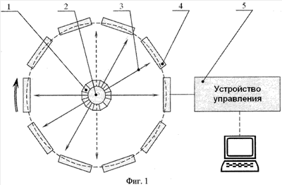 фиг.1 – принципиальная схема расположения составных частей устройства в модификации А, вид сверху: 1 – неподвижный указатель-мера в модификации А (с использованием многогранной пирамиды); 2 – неподвижный референтный лазер; 3 – одновременно возникающие лучи-отклики; 4 – закрепленный на шпинделе (вращающийся вместе с ним) кольцевой блок фотоприемников; 5 – управляющий электронный блок;