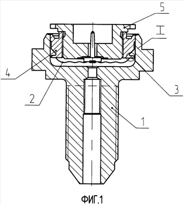 Кольцо 4 сопрягается с корпусом 1 внешней цилиндрической поверхностью и приварено к нему, причем влияние этого сварного шва на работу мембраны минимизировано.