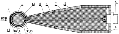 Кроме того, единый акустический волновод переменного сечения позволяет расширить диапазон амплитуд и длительностей регистрируемого импульсного давления в проходящей ВУВ за счет увеличения динамической прочности сферического ЧЭ и времени пробега ударной волны по волноводу.