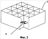 Для уменьшения времени поиска, а значит для увеличения эффективности способа обнаружения сквозных дефектов можно объединить несколько канальных течеискателей в единый блок, как показано на фиг.2, полученную конструкцию можно назвать многоканальным течеискателем. При наложении многоканального течеискателя на внутреннюю поверхность 8 емкости, заполненной жидкостью, можно более быстро, эффективно и с меньшим количеством замеров просканировать всю поверхность 8 емкости. При этом различают сигналы, приходящие от каждого течеискателя в многоканальном течеискателе отдельно. Можно составить многоканальный течеискатель требуемой формы, которая будет сопрягаема с внутренней поверхностью 8 проверяемой емкости. На фиг.3 и фиг.4 показаны варианты компоновки многоканального течеискателя для сферических поверхностей (фиг.3) резервуаров и для углов резервуаров (фиг.4).В зависимости от профиля исследуемой поверхности 8 применяют заготовленный заранее многоканальный течеискатель. При наложении многоканального течеискателя на исследуемую поверхность охватывается площадь за один прием, большая, чем при работе одиночным течеискателем. Единичные течеискатели в многоканальном течеискателе плотно прилегают боковыми поверхностями корпусов друг к другу, а сканирующими поверхностями к поверхности 8 в том месте, где присутствует сквозной дефект 10. В одном или в нескольких корпусах 1 течеискателей возникает поток 4 жидкости, истекающей через этот дефект 10. Срабатывает соответственный датчик движения жидкости 5 и дает сигнал оператору о наличии сквозного дефекта и его местонахождении в многоканальном течеискателе.