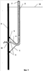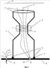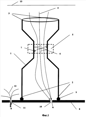 На фиг.5 представлена схема второго варианта исполнения канального течеискателя. Корпус 1 этого течеискателя представляет собой цилиндр, расширяющийся на одном из своих концов в форме купола. Сканирующее отверстие 2 находится на купольной части корпуса 1. Измерительное отверстие 3 находится на цилиндрической части корпуса 1. Измерительное отверстие 3 снабжено датчиком движения жидкости 5. Датчиком движения жидкости 5 является в этом варианте выполненный из прозрачного материала цилиндр, расположенный вблизи поверхности жидкости 13. Датчиком движения жидкости 5 могут быть турбинка, или погружной расходомер, или другие устройства. Для более плотного прилегания корпуса 1 к исследуемой поверхности 8 сканирующее отверстие 2 может быть снабжено уплотнительными прокладками 9.