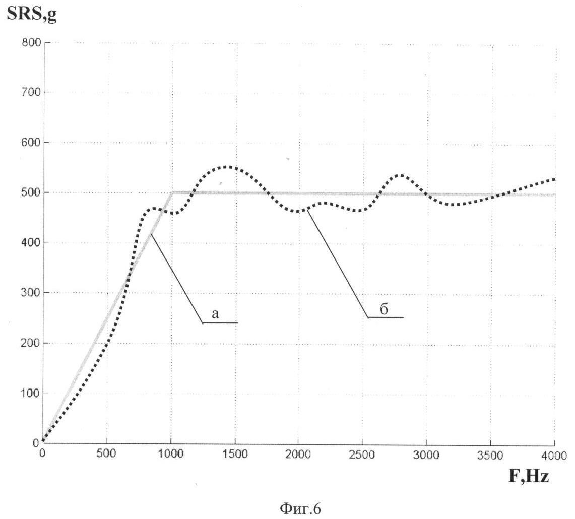 На фиг.6 показаны типовые ударные спектры ускорений (требуемый и создаваемый в процессе испытаний)
