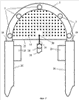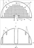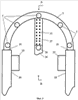 Предлагаемое изобретение отличается от прототипа тем, что корпус выполнен в виде дугообразных базовой и накладной балок, по форме и размерам копирующих друг друга с выполненными на их внутренних рабочих поверхностях выступами, с возможностью сближения указанных балок этими поверхностями между собой за счет того, что на внутренней рабочей поверхности базовой балки по периметру дуги неподвижно установлены с заостренными концами шпильки, которые подвижно размещены в сквозных направляющих отверстиях, выполненных соосно шпилькам в накладной балке, кроме того, каждая шпилька снабжена съемной зажимной гайкой и при этом шпильки и зажимные гайки составляют механизм сжатия образца, две зажимные губки выполнены съемными в виде верхней и нижней зажимных губок, представляющих собой одинаковые пластины в виде полукруга, прямой край которого выполнен в виде бортика, при этом бортик нижней зажимной губки направлен в сторону базовой балки, а бортик верхней зажимной губки направлен в сторону, противоположную от базовой балки, в плоскости нижней зажимной губки через ее выпуклый край выполнены перпендикулярно бортику сквозная срединная выемка, касающаяся бортика, и параллельно по ее обеим сторонам сквозные боковые выемки для возможности размещения в них шпилек базовой балки, в пластине верхней зажимной губки выполнены сквозные трафаретные отверстия, предназначенные для нанесения меток на поверхность испытуемого образца биологической ткани и расположенные, в частности, в квадратно-гнездовом порядке по всему полю пластины, в которой, кроме того, вблизи ее выпуклого края выполнены установочные отверстия для размещения в них шпилек базовой балки, а в средней части прямого края через бортик выполнена проточка с нанесенными на ее края центровочными рисками, предназначенными для отметки на образце биологической ткани точки, равноудаленной от выпуклого края верхней зажимной губки.