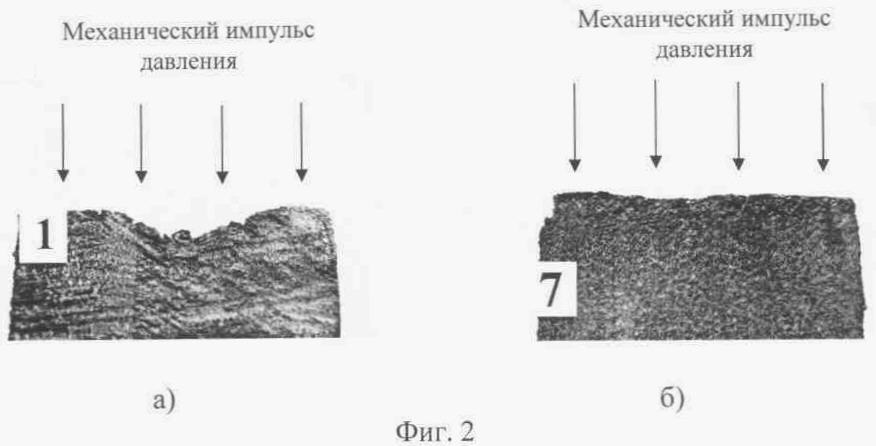 На фиг.2 представлены образцы материалов после нагружения механическим импульсом давления при применении известного по прототипу (а) и предлагаемого (б) способов. Видно, что за счет применения схемы подключения фольги с компенсацией влияния магнитного поля получено равномерное распределение генерируемого механического импульса по поверхности нагружаемого образца.