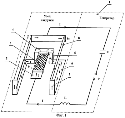 Наиболее близким по технической сущности к предлагаемому устройству (прототипом) является устройство для электрического взрыва фольги, состоящее из конденсаторной батареи емкостью С в сочетании со взрывомагнитным генератором и узла нагрузки, представляющего собой прямой и обратный токопроводы, расположенные в одной плоскости, в качестве прямого токопровода используется взрывающийся проводник, а в качестве обратного – две медные шины, расположенные равноудаленно от боковых торцов взрываемой фольги, при этом ток в прямом и обратных токопроводах течет параллельно и в противоположных направлениях [2]. Недостатком данной схемы является то, что она не позволяет обеспечить равномерное распределения импульсной нагрузки на поверхности испытываемого образца, так как распределение тока при взрыве фольги существенно неоднородно и вызывает эффект сжатия тока в плоском проводнике.