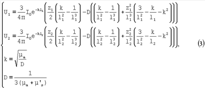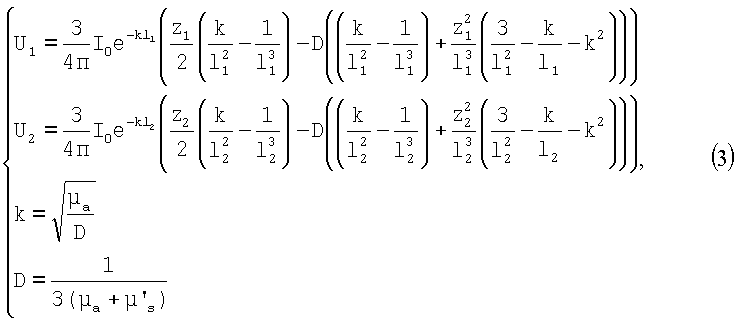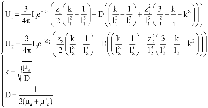 где I0 – интенсивность излучения источника; µa – коэффициент поглощения излучения; – коэффициент диффузии; µ‘ s – редуцированный коэффициент рассеяния излучения; U1, U2 – значения потока излучения в двух точках, расположенных на разных расстояниях 11 и 12 от источника направленного оптического излучения, соответственно, с координатами z1 и z2 по оси z; система координат при этом выбирается так, что ось z совпадает с направлением распространения излучения источника, а начало координат совпадает с позицией источника направленного оптического излучения.
