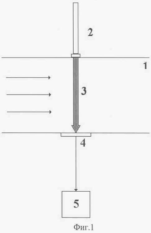 На фиг.1 показана общая схема работы устройств для фотометрии потоков жидкости или газа. В канал транспортировки (1) встраивается фотометрический модуль, включающий в себя источник направленного оптического излучения (2), облучающий поток жидкости или газа направленным оптическим излучением (3), детектор (4), измеряющий интенсивность прошедшего излучения, и систему обработки данных (5).