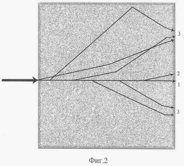 На фиг.2 показана схема прохождения тонкого пучка фотонов через рассеивающую среду: исходный пучок разделяется на баллистические фотоны (1), приосевые фотоны (2) и внеосевые фотоны (3).