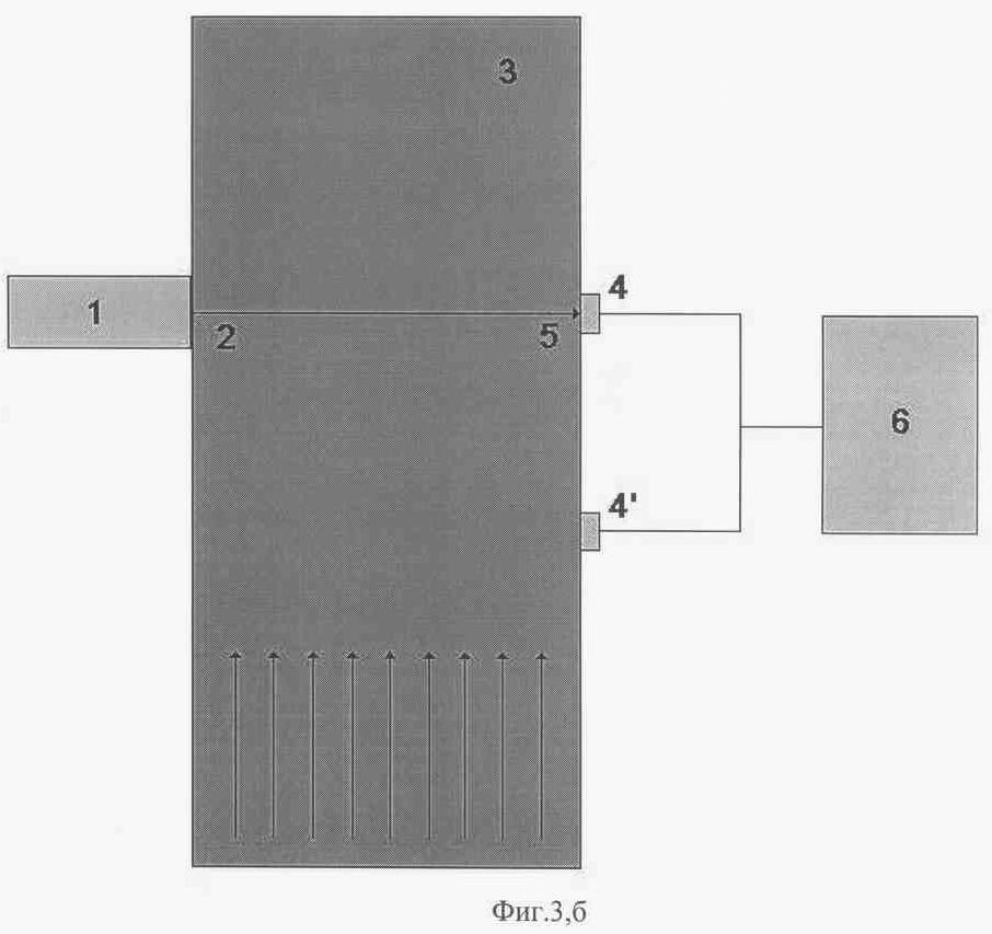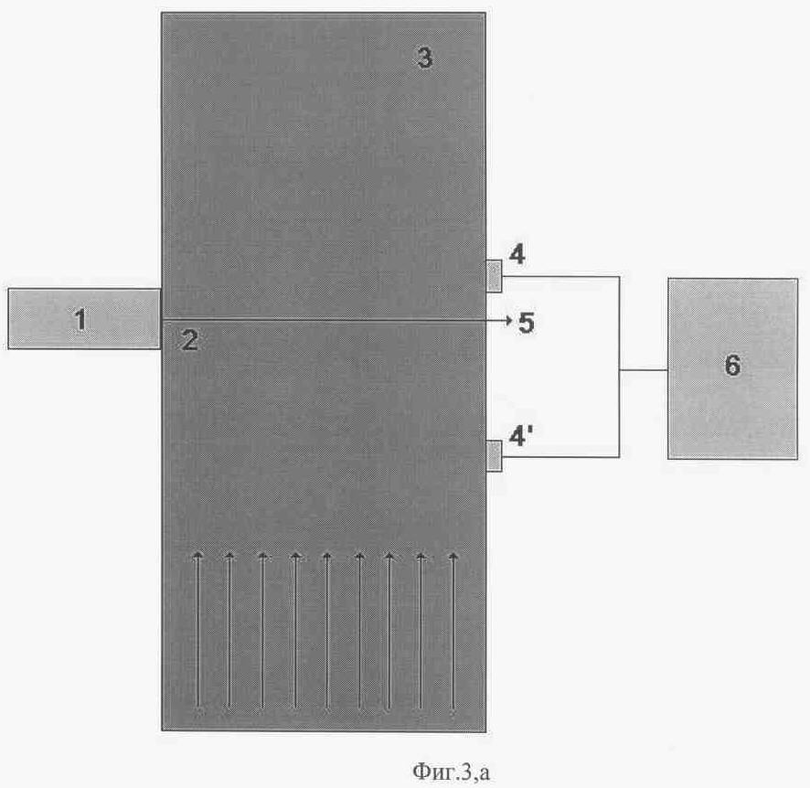 На фиг.3, а показано предлагаемое устройство, где источник (1) испускает направленное оптическое излучение (2); прошедший через канал транспортировки (3) свет регистрируется детекторами (4) и (4′), расположенными вне оси (5) источника излучения.