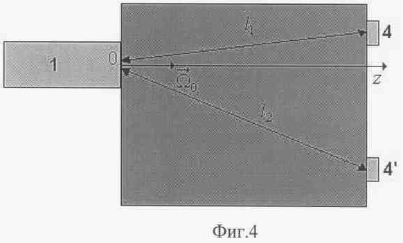 На фиг.4 проиллюстрирован выбор системы координат в предлагаемом способе фотометрии жидкости или газа при их транспортировке: начало отсчета 0 совмещается с позицией источника излучения 1, ось z совпадает по направлению с направлением распространения излучения источника, детекторы 4 и 4′ располагаются на различных расстояниях l1 и l2 от источника так, что чувствительная поверхность обоих детекторов перпендикулярна оси z.