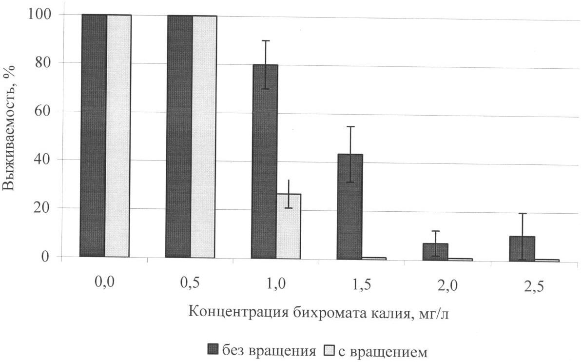 В пробирки емкостью 100 см3 в трех параллельных сериях наливается по 50 см3 раствора бихромата калия различных концентраций. В качестве контрольной воды используется отстоянная водопроводная вода. В каждую пробирку помещается по 10 особей Daphnia magna в возрасте 6-24 часа. Часть пробирок наклонно устанавливаются во вращающуюся кассету устройства для экспонирования рачков. Скорость вращения, составляющая 5-10 об/мин, обеспечивает сохранение жизнеспособности 100% дафний в контрольном варианте опыта. Другая часть пробирок с тестируемым раствором устанавливается в неподвижном вертикальном положении. Подсчет живых особей во всех вариантах опыта производится после 48 часов экспонирования. Результаты эксперимента (см. чертеж) показывают, что при концентрации 1,0 мг/л бихромата калия в варианте с вращением выживает 30% особей, следовательно, расчетная концентрация, при которой наблюдается 50% смертность тест-организмов, составит 0,8 мг/л. В неподвижно установленных пробирках (без вращения) смертность на уровне 50% наблюдается только при концентрации бихромата калия 1,5 мг/л. Следовательно, вращение емкостей с тестируемыми пробами воды увеличивает чувствительность содержащихся в них рачков к токсикантам.